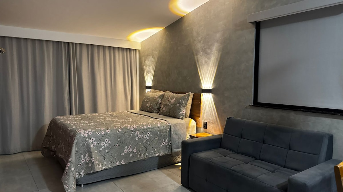 Apartmani bez dnevnog boravka koji se sastoje od spavaće sobe/kuhinje/PRIVATNOG KUPATILA sa 1 parking mestom sa automatskom kapijom 1,7 km od Praia do Peró i Conchas, 3 km od Japanskog ostrva, 7 km od Praia do Forte, 20 km od Búziosa ili Arraiala. Proximidades: Market, Bakery and Pharmacy and easy access to transport, non-stop bank. Prozor naprijed sa pločom za kuvanje sa 4 usta ugrađene u sudoperu bez rerne sa pametnim TV-om od 81cm i klima-uređajem. Zajednički prostor za usluge i mikrotalasna pećnica! Wi-Fi je uključen Gekaj Apartam