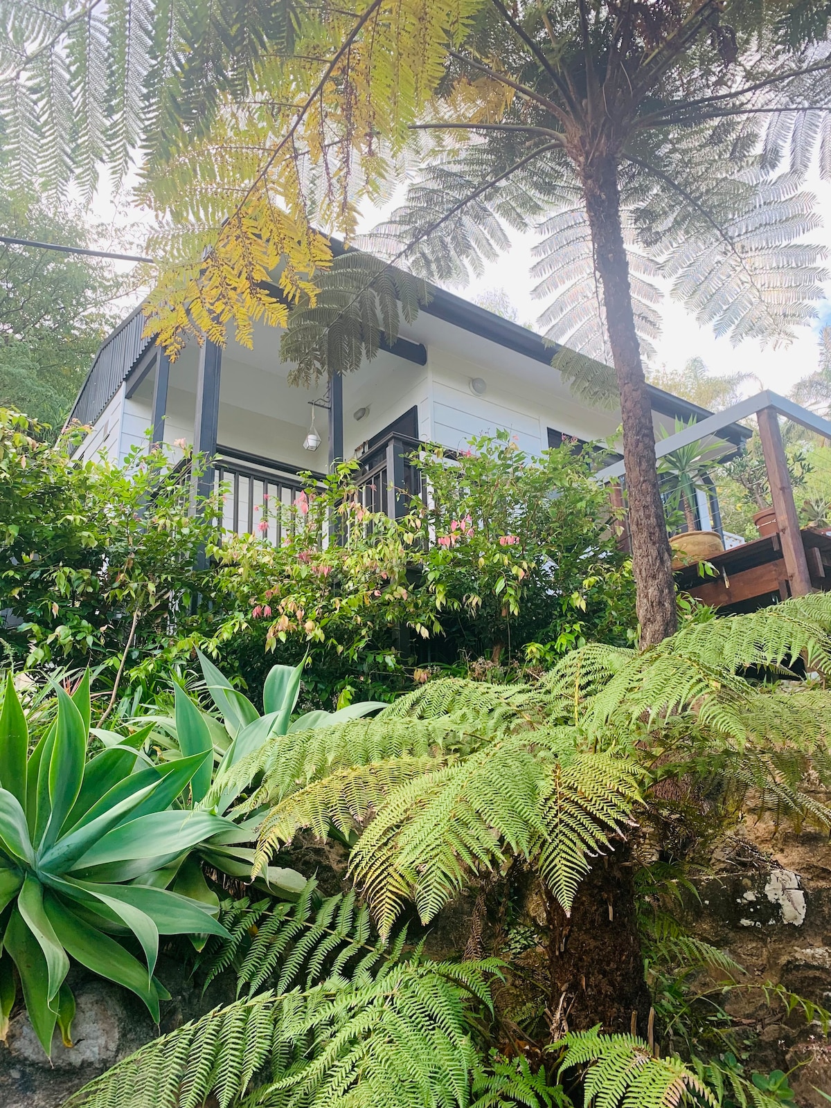 Luxury studio in a tropical garden,30 metres to beach front, designer bathroom with bath and rain shower, washing machine. A fully equipped kitchen, 1 queen size bed, fan, underfloor heating, outdoor deck with sea views and under cover private gazebo with lounge seating and electric barbecue /grill ,and all weather blinds. Your well behaved dog is welcome with its own bed and leashed between house and dog friendly beach at end of the garden..we are surrounded with wildlife that is protected .