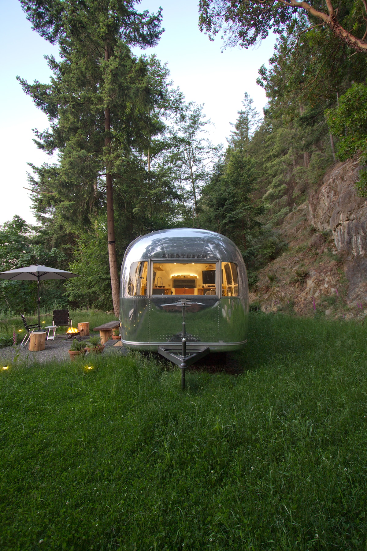 Introducing Moonshot the Landyacht, the Airstream at Wildernest! A perfect getaway just a 20 minute ferry ride from West Vancouver on the forested slopes of Bowen Island. This 1971 Airstream has been totally rebuilt into a super comfortable and memorable escape. It's a great couple's vacation, completely private on its own acre of land. There's a separate indoor heated bathroom and shower, plus an outdoor hot water shower and vintage bathtub built for two.