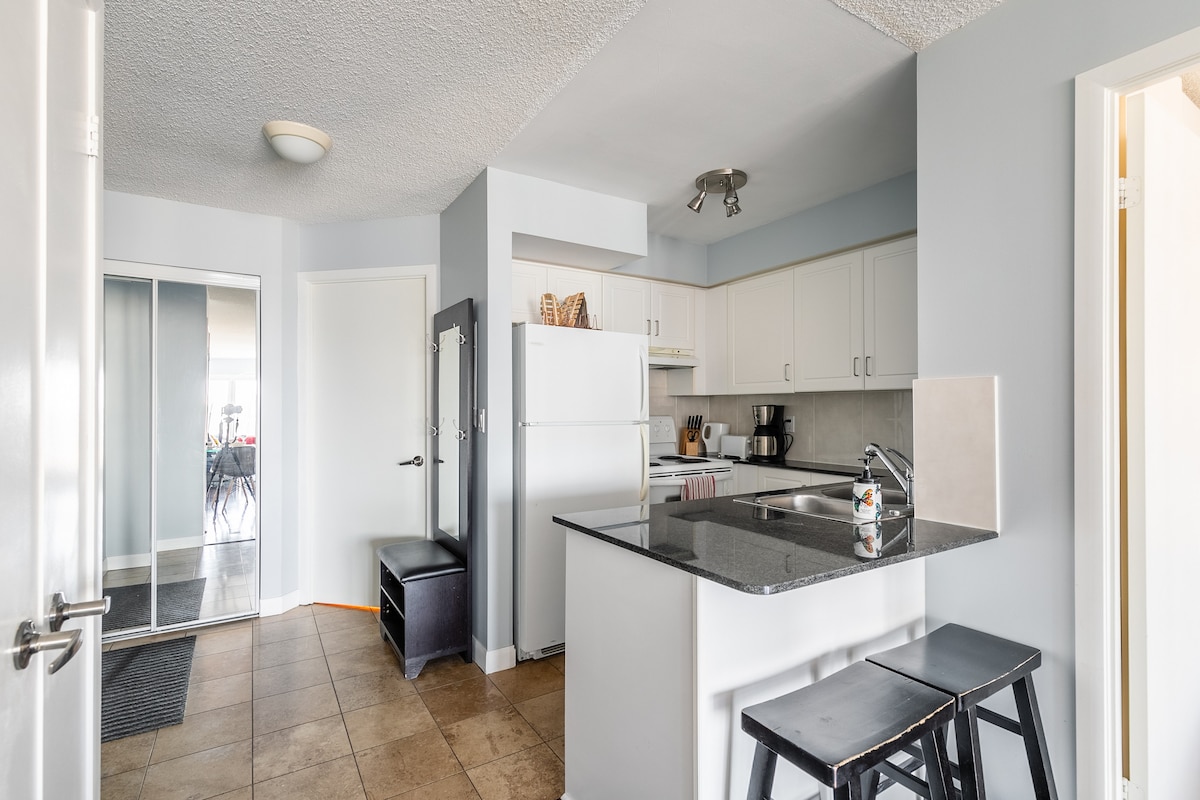 Savršen odmor u centru Toronta! - Rijetki visoki sprat. Deluxe bračni krevet i bračni krevet, kupatilo, kompletna kuhinja, udoban apartman sa prozorima od poda do plafona sa predivnim pogledom na grad. - 10/10 walk score to Eaton Center, Dundas Square, Ed Mirvish Theatre, Allan Gardens, Nathan Philips Square - On Yonge TTC Subway Line: Queen station, Dundas station - Šetnja do stanice Union, CN Tower, Lakeshore, Queen Street, King Street - Pristup javnom prevozu iz predvorja kondominijuma