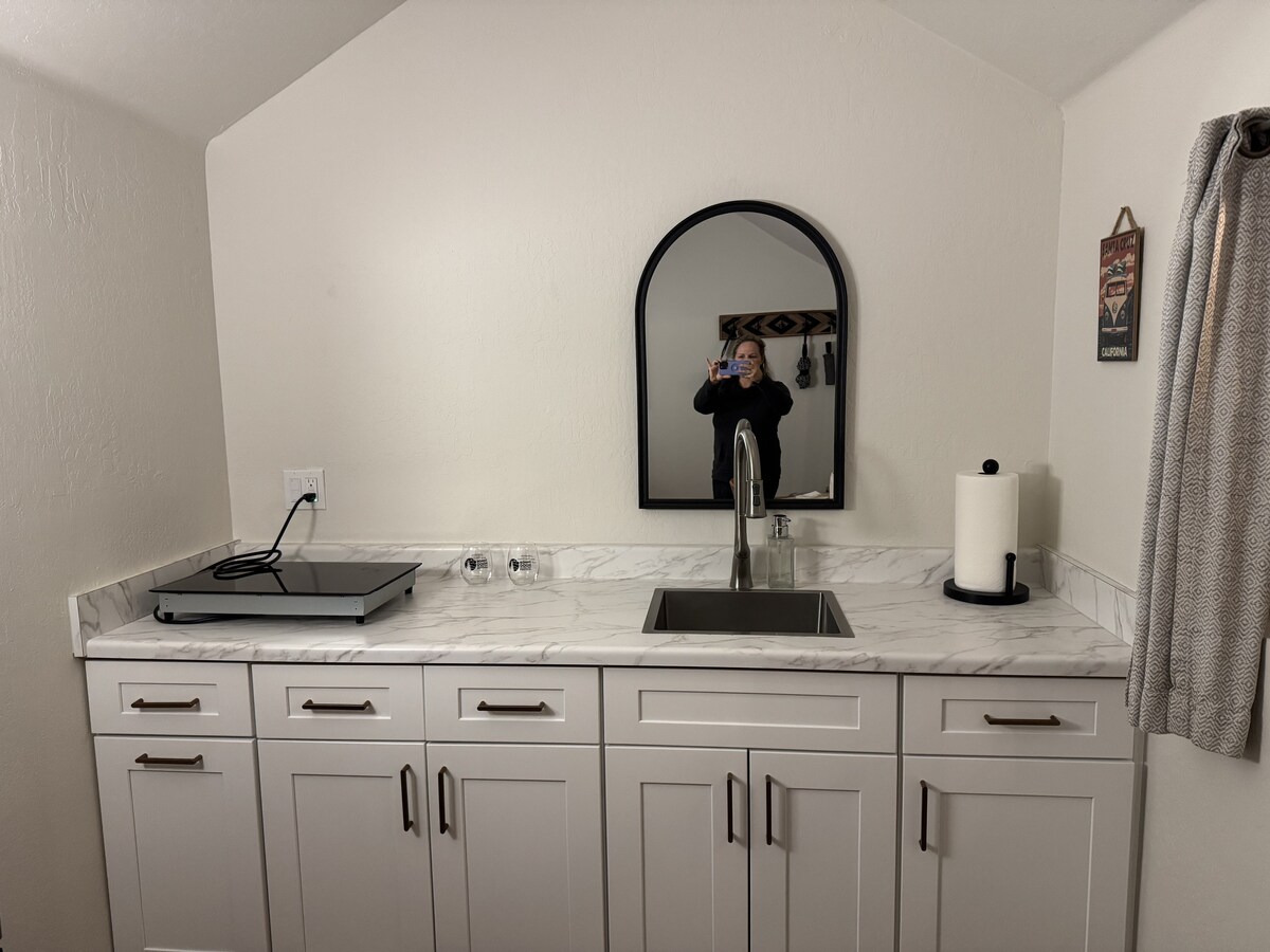 One-bedroom attached in-law suite with private entrance- relaxing den with large leather couch, flat screen tv (Roku/no cable) kitchenette w/hot plate and private bath. Mountain location 2.5 miles down a very narrow scenic ridge-top road attached to our primary residence on 6 beautiful acres of lush vegetation and towering redwood trees. Ideal for a couple or small family looking to explore the Santa Cruz county Mountains, Bay Area and coast without breaking the bank.