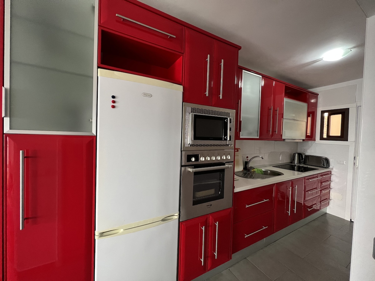 Prelep apartman u novom modernom luksuznom kompleksu u Palm Maru. Ima sve što vam je potrebno za udoban boravak: šarmantnu spavaću sobu sa velikim krevetom (1,80 m), 2 kupatila, potpuno opremljenu kuhinju (sa mašinom za sudove, rernom, tosterom, aparatom za kafu, mikrotalasnom rernom itd.), brzi Wi-Fi, pametni TV. Na raspolaganju je i jedno parking mesto. U dnevnoj sobi i u spavaćoj sobi postoje klima-uređaji koji rade veoma dobro kada se istovremeno uključe. Osetićete se prijatno na velikoj i mirnoj terasi okrenutoj ka jugu (24 m²) sa velikim kaučem, uživajući u prelepom pogledu na Nacionalni rezervat i okean u intimnoj i romantičnoj atmosferi. Pogled na zalazak sunca je takođe veličanstven ovde. Dnevni boravak je prostran i udoban, a veliki kauč sa mnogo jastuka može lako da se pretvori u udoban bračni krevet. U unutrašnjem dvorištu kompleksa nalazi se prelepa bašta, a ako želite, možete da posetite fitnes centar, a možete i da plivate u jednom od dva bazena sa grejanjem ili da se jednostavno sunčate. Prekoputa se nalaze supermarket, voćara i italijanski restorani, a na pešačkoj udaljenosti od kompleksa nalazi se veliki broj restorana, barova i kafića. Nema na čemu!