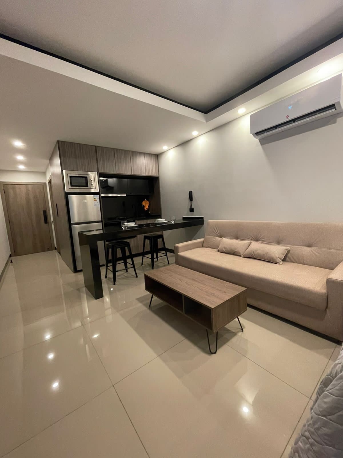 Suite de diseño en Piso 16, en zona más exclusiva de Bolivia, a 3 min del Ventura Mall y zona empresarial, con vistas premium. 2 pisos de áreas sociales: piscina, jacuzzi, sauna seco y vapor, cine, gimnasio, área de footing, sala de masajes, parrilleros, cafetería con heladería, paseo gourmet, karaoke y salón bar. Room Service: desayuno, almuerzo, cena, postres,cócteles, lavandería y limpieza (servicio extra) Cama King, mobiliario premium y bar. Suite inteligente, controla todo con Alexa.