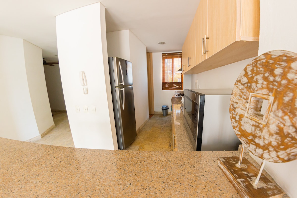 Los pisos altos y bajos estan sujetos a disponibilidad. NO SE PERMITEN VISITAS EN LOS APARTAMENTOS. Area 108m2. Cuenta con escritorio de trabajo con lámpara y silla de trabajo en cada habitación, caja fuerte por habitación, dos baños con amenities como shampoo, acondicionador, shower gel, papel higiénico, Toallas de cuerpo, manos y tapete para pies. Cocina totalmente equipada, zona de labores con lavadora, Tabla de planchar y plancha, balcón, sala, comedor y sofá cama.