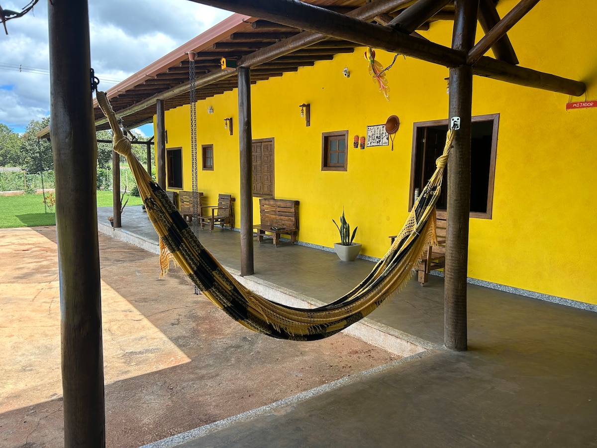 Okružen dvorištem autohtone vegetacije cerrado, Canto Acá je udoban sa predivnim pogledom na planine! Akončega može udobno da primi do 8 osoba, po 4 na svakom spratu (2 kupatila). Ali je savršen i za parove, manje grupe, zbog svoje posebne konfiguracije. Ima kompletnu kuhinju, viseće ležaljke i spoljni tuš za osvježenje. Ostavljamo kuću napola „prozirnu” tako da planine i mjesec mogu da uđu...ali sa zamračenjima u sobama! 1 km od centra. Dobro došli! Dobro došli!