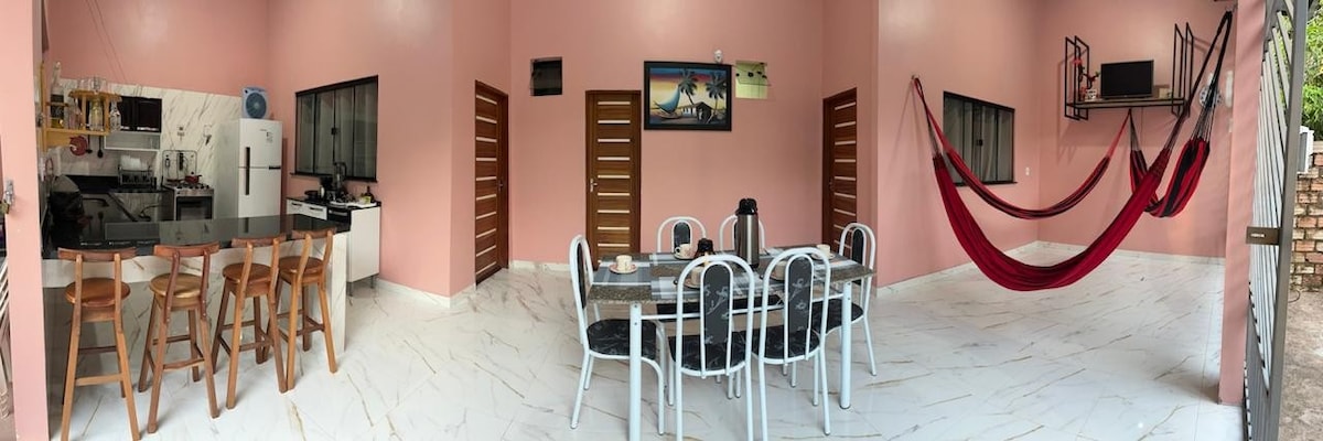 Relaxe com toda a família ou seus amigos nesta acomodação tranquila em Alter do Chão. Casa localizada a 3km da orla, menos de 10 minutos de carro ou média de 30 minutos de caminhada. Espaço em meio as árvores, você poderá ouvir o canto dos pássaros em um ambiente tranquilo. Possuímos uma área gourmet com churrasqueira, e uma piscina com hidro que poderá complementar seu lazer no Caribe Amazônico. Em nossa varanda podemos disponibilizar redes para descanso. Wifi de alta velocidade.