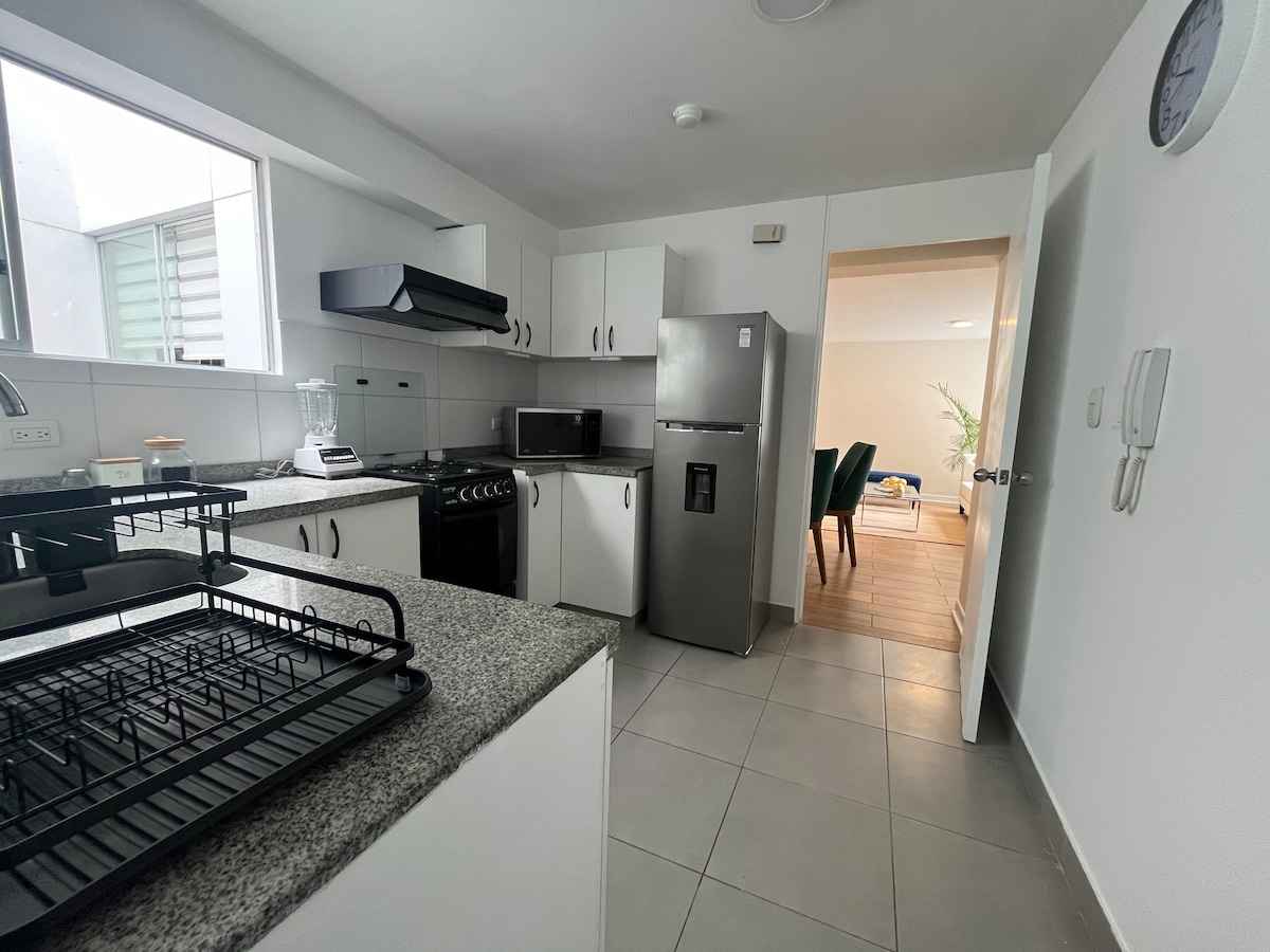 Prostran i elegantan stan u srcu Baranka. Privilegovana lokacija: Koraci od glavnih turističkih mjesta Baranko i Miraflores, najboljih restorana, barova i umjetničkih galerija. Glavna spavaća soba: bračni krevet i veliki ormar. Svijetli i otvoreni prostor: dnevni boravak i čajna kuhinja s prirodnim svjetlom. Privatni parking - u zavisnosti od dostupnosti Zajedničke prostorije: teretana, okruženje za sastanke i prostor za igru za djecu. Minimalistički stil.