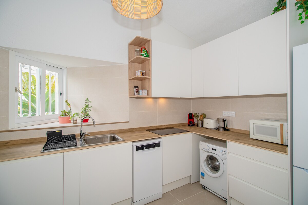 Vrhunska seoska kućica u zelenilu sa sopstvenim stilom. U novouređenom stanu imate prostor za opuštanje, kuvanje, jelo i rad u kućnoj kancelariji. Uživajte u zalasku sunca udobna terasa sa kaučem. Sa bračnog kreveta možete da vidite i čujete more. Najduža i najlepša prirodna plaža na Tenerifima nalazi se ispred ulaznih vrata - 5 minuta hoda do vode. Osim toga, do centra Tejita ima samo 8 minuta hoda sa restoranima i supermarketom.