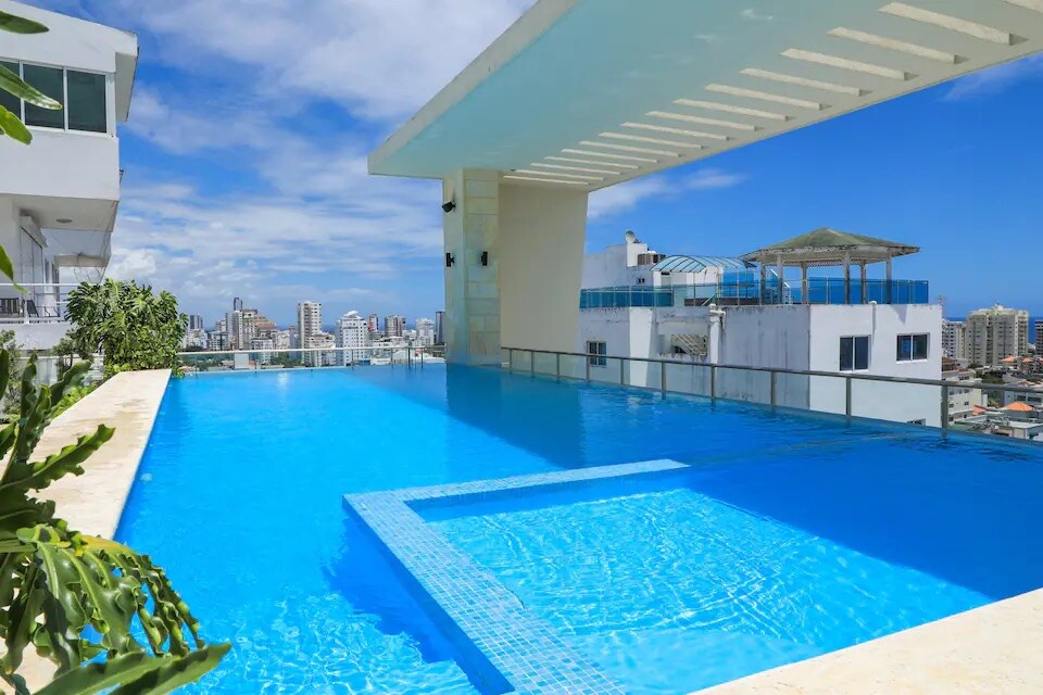 Luksuzan apartman, sa svim što vam je potrebno za prijatan boravak. Bićete blizu najznačajnijih lokacija u Santo Domingu. Sauna Staza za trčanje Teretana Beskonačni bazen na krovu Klimatizovani lobi 24/7 2 parking mjesta TV u svakoj sobi Potpuno opremljena kuhinja Trpezarija na otvorenom Bioskop Neverovatan pogled!