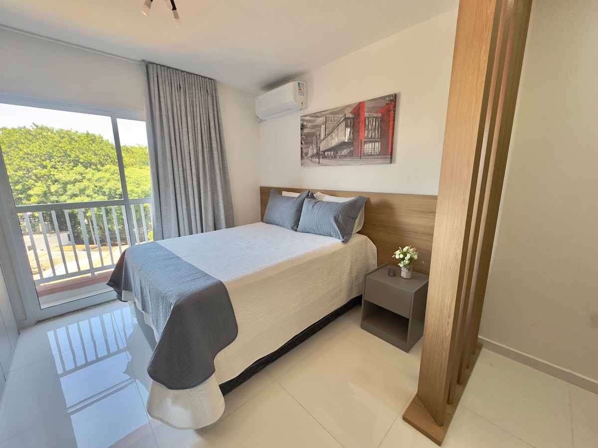 Veliki stan od 40 m2, ima spavaću sobu sa bračnim krevetom, 02 SMART TV sa kablovskim kanalom, američku kuhinju sa pločom za kuvanje, mini barom, mikrotalasnom pećnicom, blenderom, električnim kuvalom, loncima i tiganjima i osnovnim priborom za pripremu obroka. Svakodnevno održavanje i pospremanje Usluga parkiranja non-stop. Teretana, vanjski bazen, sauna, bilijarski sto i dom. Region opslužuju supermarket, apoteka, pekara , prodavnica namirnica; pored av. Goiás i vrlo blizu Santo Andrea.