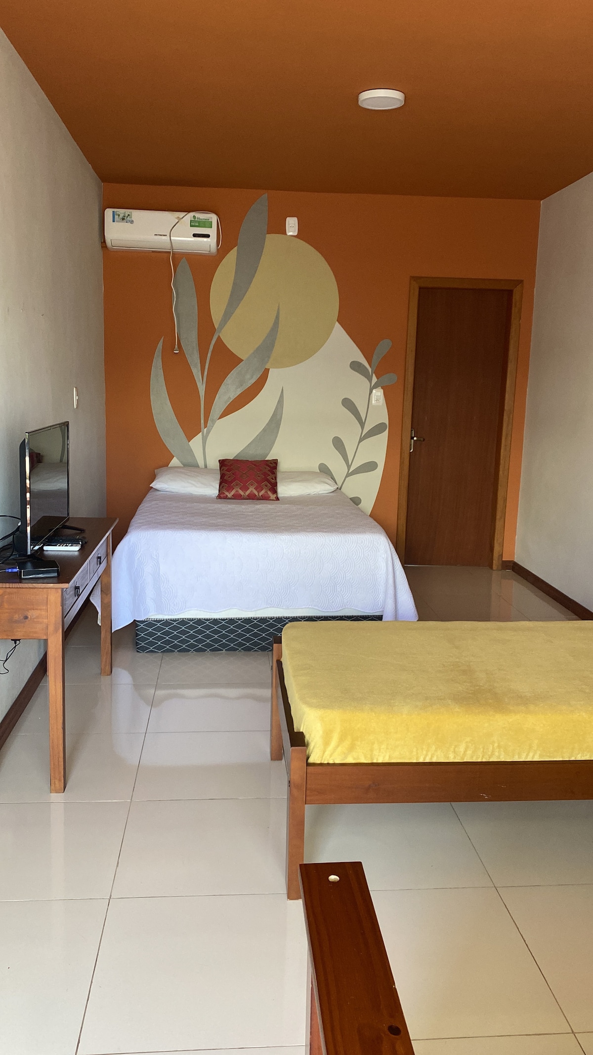 Uma Suíte da Árvore com 25m2 de área, para até 04 pessoas junto ao hotel, se encontra na mesma zona interna do hotel e pode desfrutar de toda a estrutura hoteleira. Características - dormitório para 03 pessoas com 01 cama matrimonial e 01 individual ou 02 individuais, ar condicionado split, TV, 01 banheiro privado.