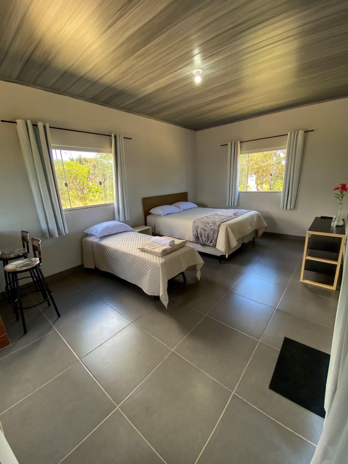 Na odličnoj lokaciji, 3 km od centra Alto Paraíso, 40 km od nacionalnog parka Čapada dos Veadeiros i samo 900 metara od prelepog kristalno čistog vodenog kompleksa, vodopada Loquinhas. Mirno i tiho mesto, daleko od gradske vreve. Naš smještaj vam omogućava da budete blizu gradskih sadržaja, a istovremeno uronite u prirodu. • Bračni krevet (širine 150-179 cm ) •Ventilatori • Dodatni jastuci • Na raspolaganju je Aleksa •Pegla •Osnovna oprema Teško •Mreža za komarce