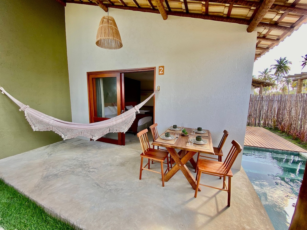 Um chalé exclusivo para casal, com piscina privativa e total privacidade, na Praia de Tatuamunha. Ideal para quem busca descanso, conforto e um clima romântico na Rota Ecológica dos Milagres. Você pode aproveitar um passeio de jangada pelas piscinas naturais e apreciar o magnífico pôr do sol na ponte do rio Tatuamunha. Com um pouco de sorte, poderá avistar o famoso Peixe Boi. Além disso, fica próximo à Guajá Vila Gourmet, onde você encontrará uma variedade de bares, restaurantes e artesanato.