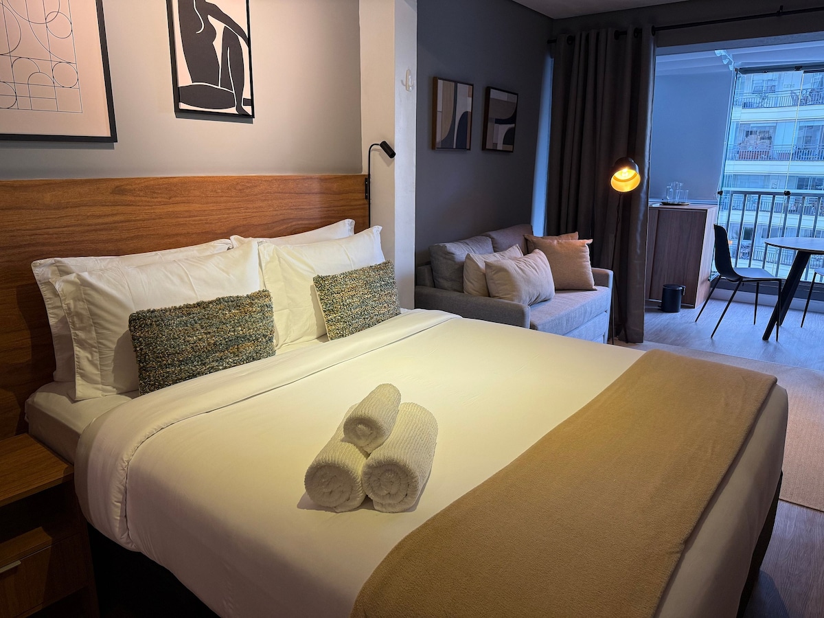 Experience One Eleven in Vila Olimpia. This modern apartment features large windows with breathtaking city views and natural light. The unit boasts 600 Mbps internet and a 4K HD TV. For total comfort, it has a Hot/Cold AC system: 27,000 BTU/h unit in the living room and 10,000 BTU/h in the bedroom. The bedroom is quiet and dark for a restful sleep. Impeccably maintained, you’ll be walking distance to top restaurants and business hubs—a safe, upscale retreat with a stunning urban backdrop.