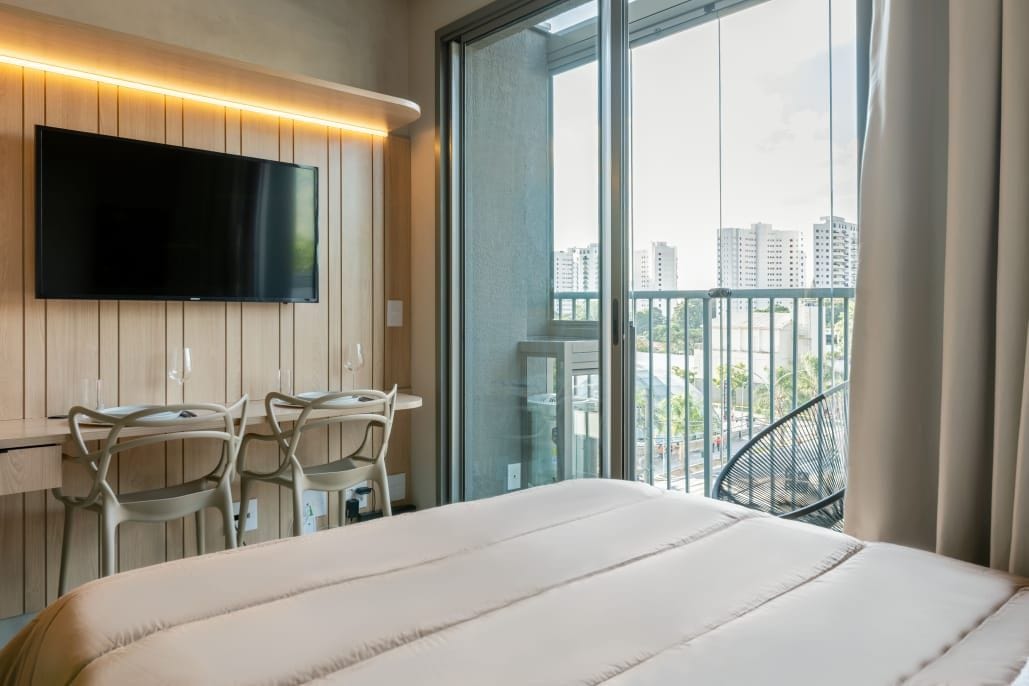 Nosso studio de 23m² é ideal para até 2 pessoas, oferecendo uma cama Queen em um ambiente aconchegante e funcional, com uma vista linda. O condomínio dispõe de área de lazer completa (piscina no rooftop, salão de jogos e sauna, permitido p/ estadias superiores a 3 meses) mercadinho no térreo e portaria 24hrs. O apto está localizado a apenas uma quadra do metrô Adolfo Pinheiro (Linha 5 - Lilás) e próximo à Universidade Santo Amaro, proporcionando mobilidade e praticidade para sua viagem.