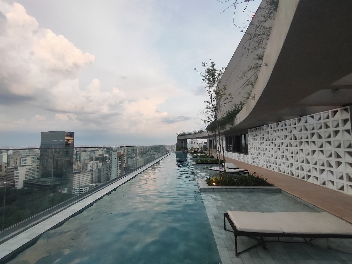 Novi studio s panoramskim pogledom — 24. sprat s beskonačnim bazenom i stilom! Uživajte u Sao Paulu u udobnosti i stilu u našem studiju, koji je s ljubavlju spreman da vam poželi dobrodošlicu. Nalazi se na 24. spratu sa *180° staklenim pogledom na autoput Pinheiros *. Moderno utočište, idealno za one koji traže praktičnost, praktičnost i jedinstven doživljaj u gradu.