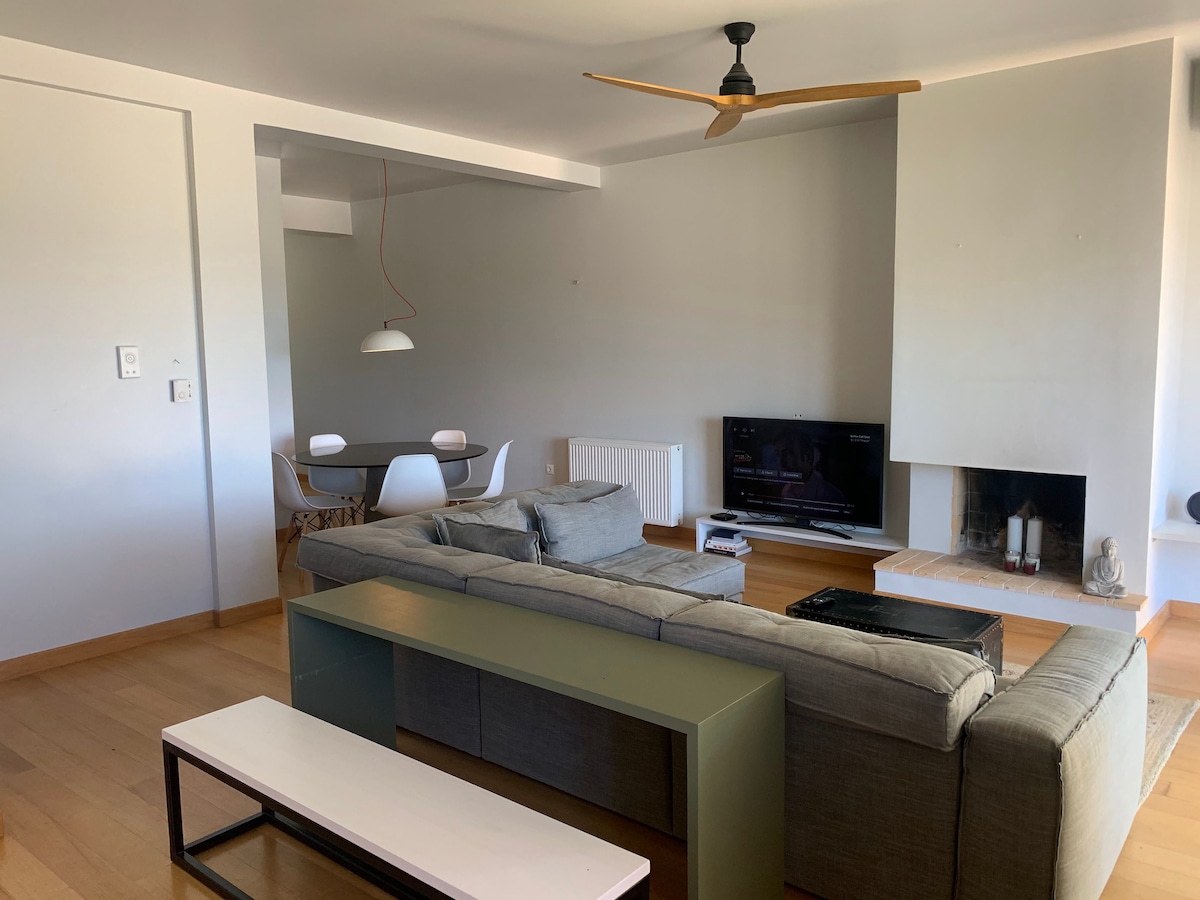 Doživite luksuz na obali u ovom renoviranom 2BR stanu u Saronidi, Atika. Samo 2 minuta do plaže, 20 minuta do aerodroma. Potpuno opremljen sa 3 balkona, liftom i prostorom za rad. Uživajte u klima-uređaju u svakoj sobi, TV-u i Wi-Fi mreži. Bračni krevet (širine 180-179 cm) i 2 odvojena kreveta i kauč. 🌟 Rezervišite sada za odmor iz snova! ✨🏝️