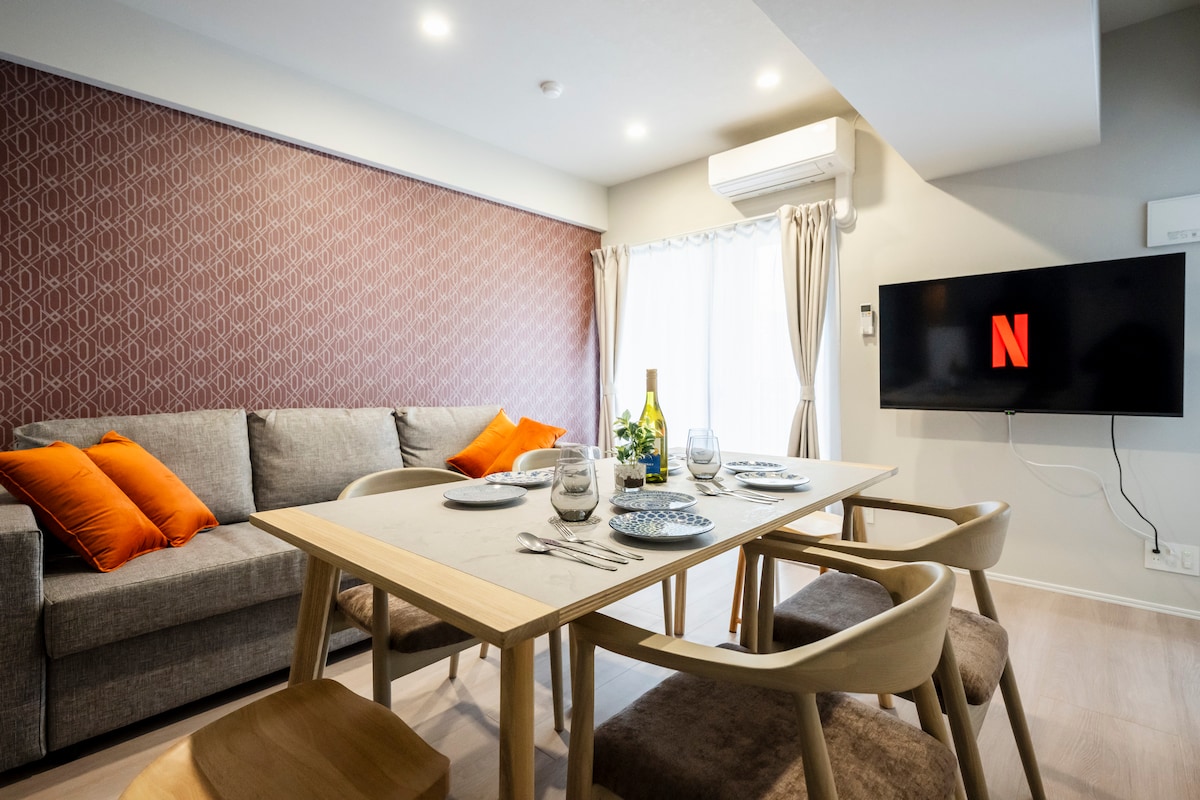 This elegant 2025-built apartment is a 4-minute walk from Nagasaki Station, near Stadium City and Dejima Messe, accommodating up to 6 guests—perfect for families or groups. The living room has a smart TV for movies and videos, and the balcony offers stunning views with chairs and a table. Vending machines are on the first floor. Nearby are convenience stores, supermarkets, malls, pharmacies, and car rentals. Stadium City, within walking distance, also features hot springs and saunas.