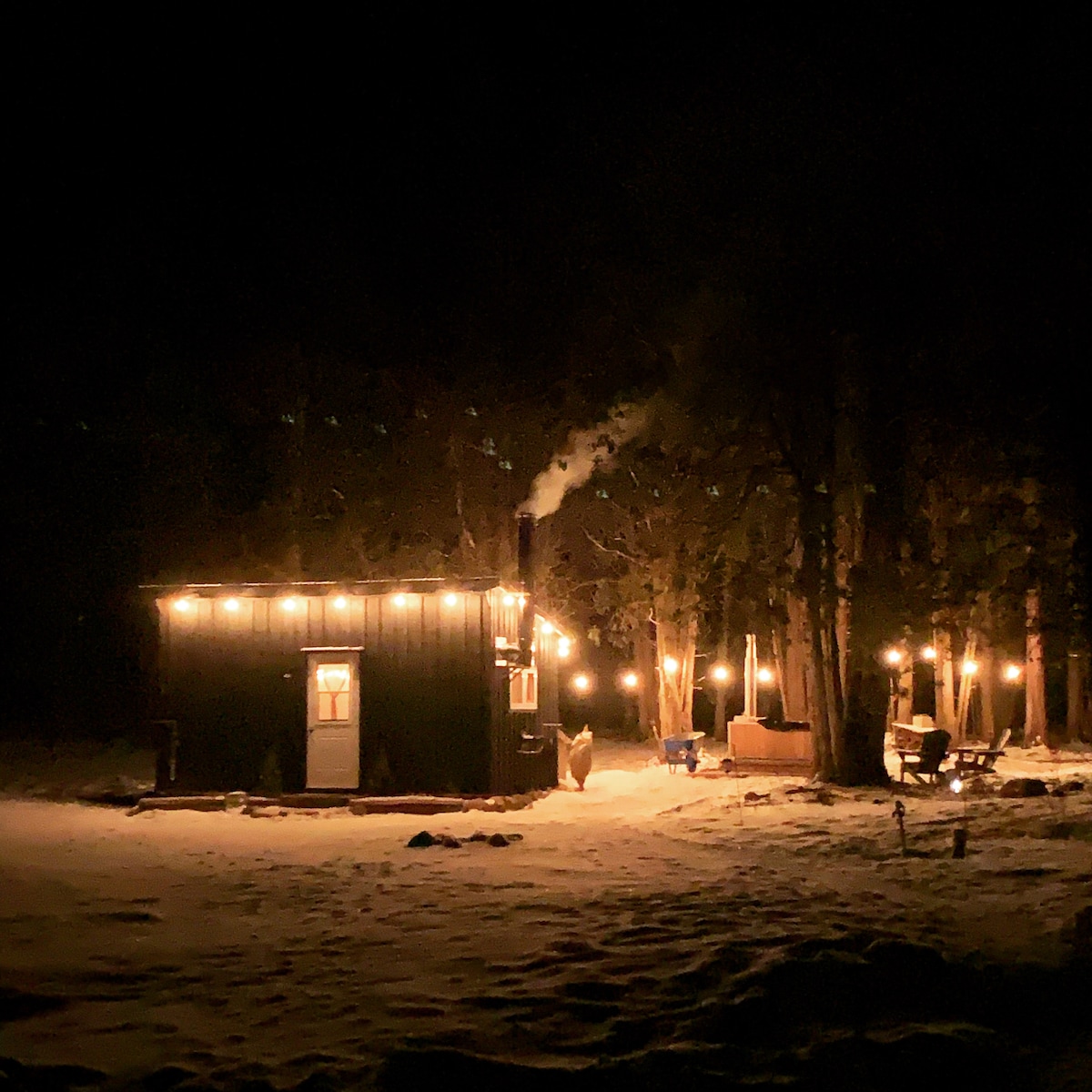 Experience a unique winter camping retreat for two in our wood-stove-heated tiny home. Complete with an outdoor shower, outhouse, covered hot tub, and a propane BBQ for cooking. The campfire pit and picnic table sitting area are open all year. This holiday rental setup is designed for couples and located on our working hobby farm right off a main highway. * Please note, the outdoor shower and bar closes seasonally due to freezing temperatures with no alternative available. Reopens May 2026.