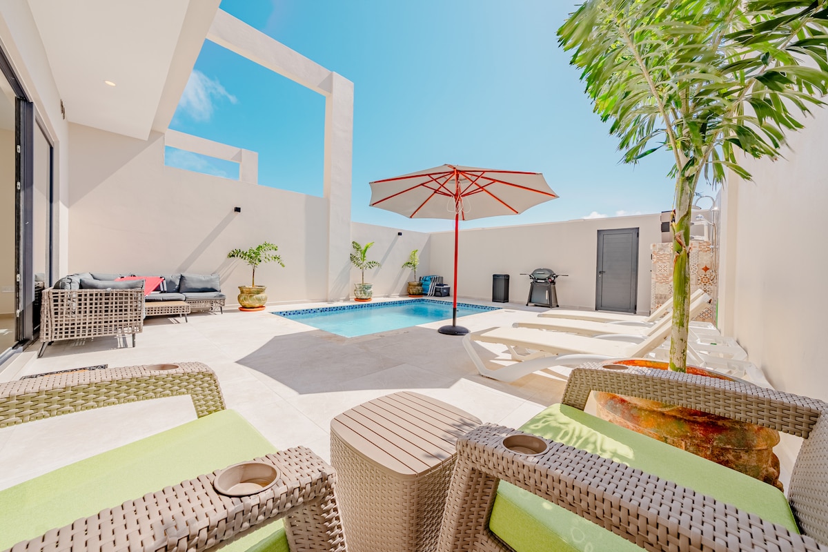 ZAPANJUJUĆA POTPUNO NOVA MODERNA LUKSUZNA KUĆA U NIZU, koja se nalazi u LeVent Beach Resortu. Prostor ima 2 spavaće sobe, sa privatnim bazenom i terasom. Ukus privatnosti u odmaralištu sa pristupom svim sadržajima, uključujući danonoćno obezbeđenje, teretanu, bazen i još mnogo toga. Samo nekoliko koraka od plaže Eagle Beach, koja se smatra najboljom plažom na Arubi. Opustite se i uživajte u 2 spavaće sobe, 2,5 kupatila, prostranom dnevnom boravku na 2 sprata (~1500 kvadratnih metara) sa sopstvenom terasom na krovu. Lako može da primi do 6 gostiju.