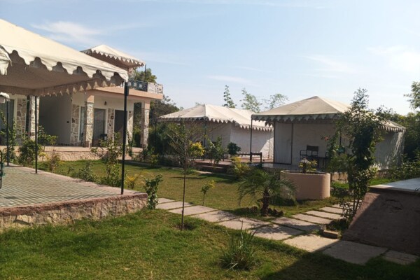 Experience a luxurious jungle stay in the heart of Ranthambore, where heritage elegance meets modern comfort. This spacious luxury tented cottage is thoughtfully designed with a royal touch, featuring a handcrafted four-poster wooden bed, premium linens, and warm ambient lighting that creates a cozy yet regal atmosphere.