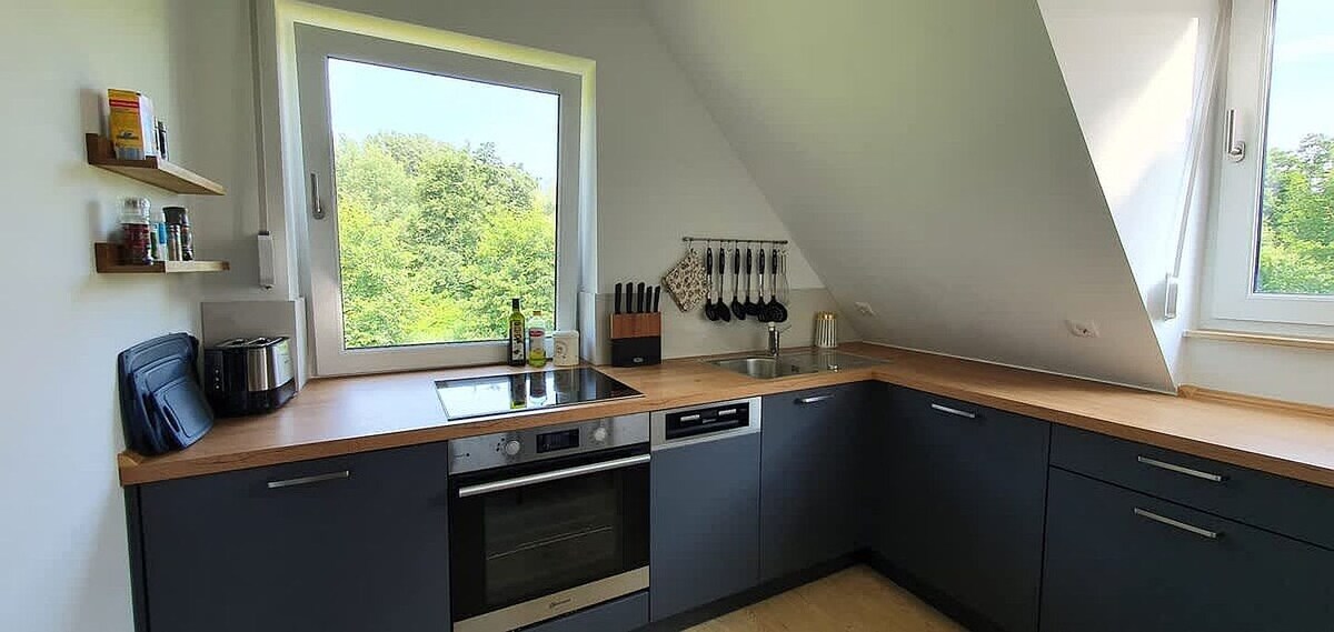 ... look out of your bed onto the water, enjoy the peace and quiet and listen to the rustle of the beech forest, experience bike tours directly on the water and enjoy nature. A beautiful, modern and rustic, low-energy half-timbered house with thatched roof, Moroccan tiles, oak floorboards and clay plaster walls awaits you. For activities there is a beautiful large garden with a forest swing, free steam sauna, outdoor shower and tub, a standup paddle, a paddle boat and 4 bicycles.