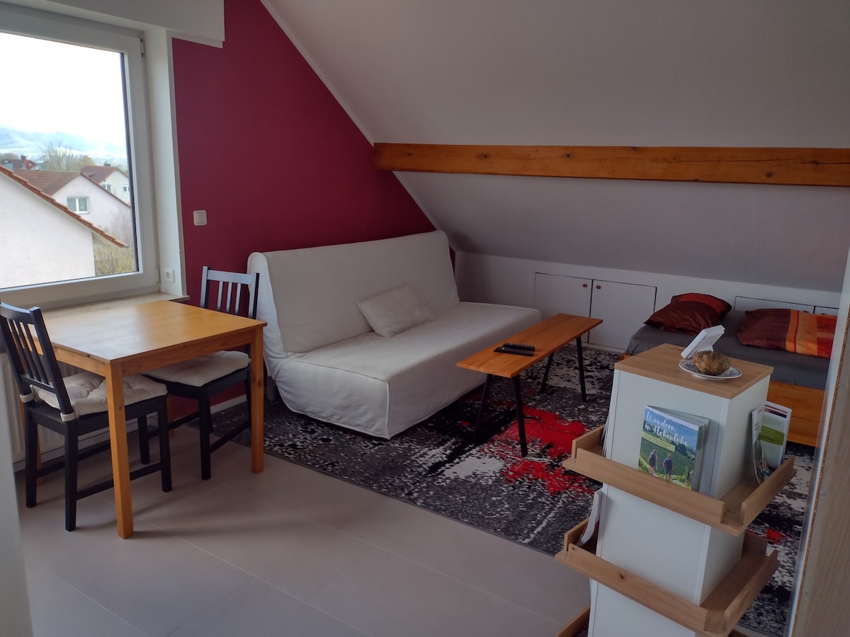 Gemütliches, helles Dachgeschoss- Appartement in einem großzügigen Zweifamilienhaus in ruhiger waldnaher Lage in Weinsberg. Ob Künstler, Pendler, auf Montage, Wander-, Wein- und Kurzurlauber, ob allein oder zu Zweit, als Ausgangspunkt für alle Unternehmungen im vielfältigen Weinsberger Tal ist die Unterkunft bestens geeignet. Pantry-Küche(ausserhalb des Schlafraumes) eigenes Bad und Balkon bieten die nötige Unabhängigkeit und Rückzugsmöglichkeit.
