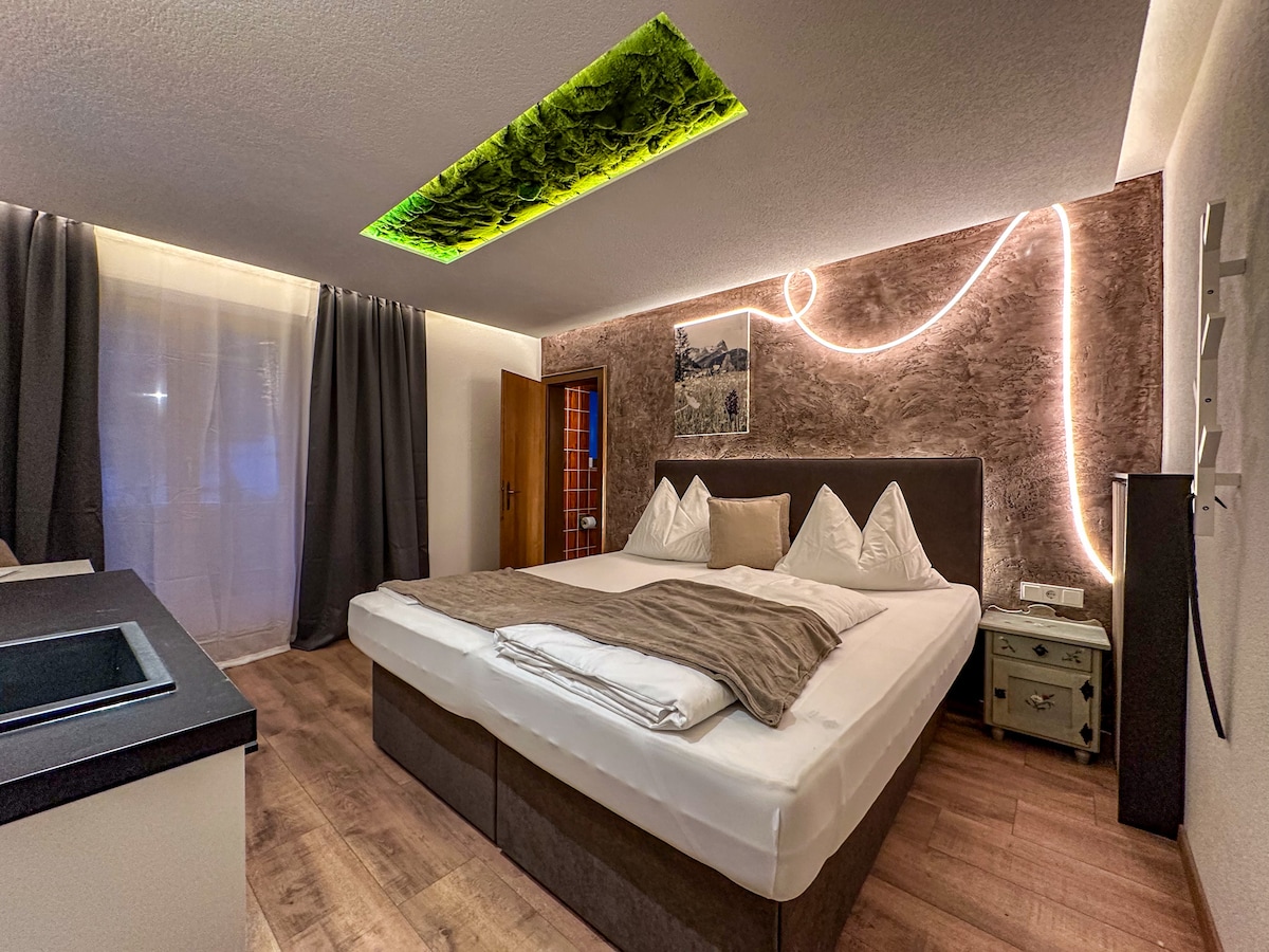 Doživite čistu udobnost u našem elegantnom studiju od sijena! Ovaj šarmantni studio kombinuje prirodne boje i topao dizajn inspirisan ljepotom tirolskog pejzaža. Opremljen udobnim krevetom, malom čajnom kuhinjom i modernim kupatilom, ima sve što vam je potrebno za opuštajući boravak. Savršeno za parove ili putnike koji putuju sami i traže miran odmor. Uživajte u blizini prirode i tirolskog šarma!