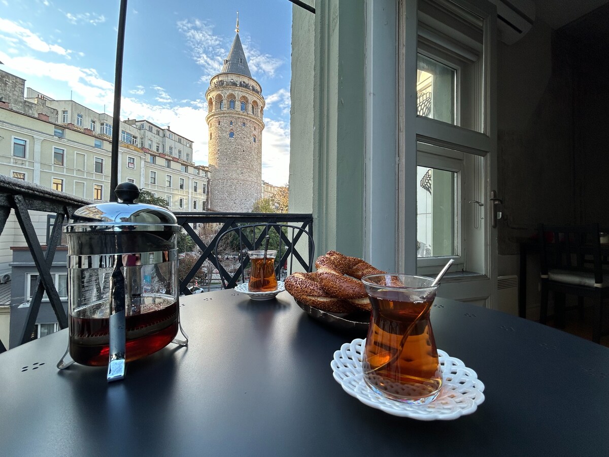 Apt is in one of the most famous historical building of İstanbul. It has a spacious balcony with panoramic view of Galata Tower, Historic Peninsula, Golden Horn. The apt. has all the amenities you may need, it is 1 minute walk away from the famous Galata Tower. It is newly redecorated. The building is located on a quite street just 250 meters to the Sişhane subway station and 200 meters to İstiklal Street which is the main shopping, dining and entertainment district.