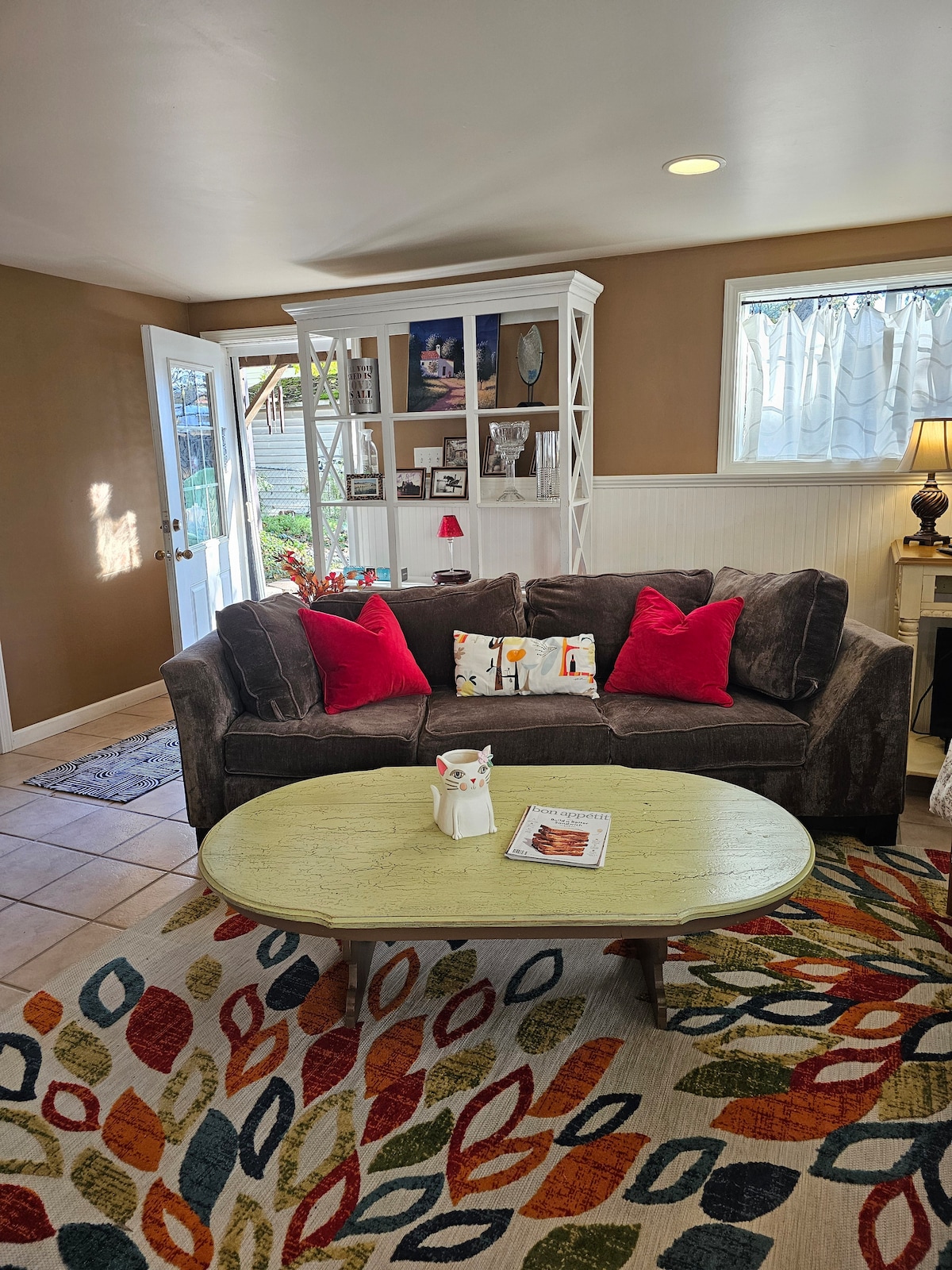 Two giant walnut trees shelter you as you round the curving path to your door. Flowers, the gentle sound of a fountain, dappled sunlight and rolling green lawn and a campfire circle greet you. Level entry, free parking, and just 5.1 miles to Airport! Upon arrival, you will find the door open for you and some ambient lighting on and the keys just on the entry shelf. Please call or text the day before to confirm arrival time (late flights nights arrival are okay with previous discussion).