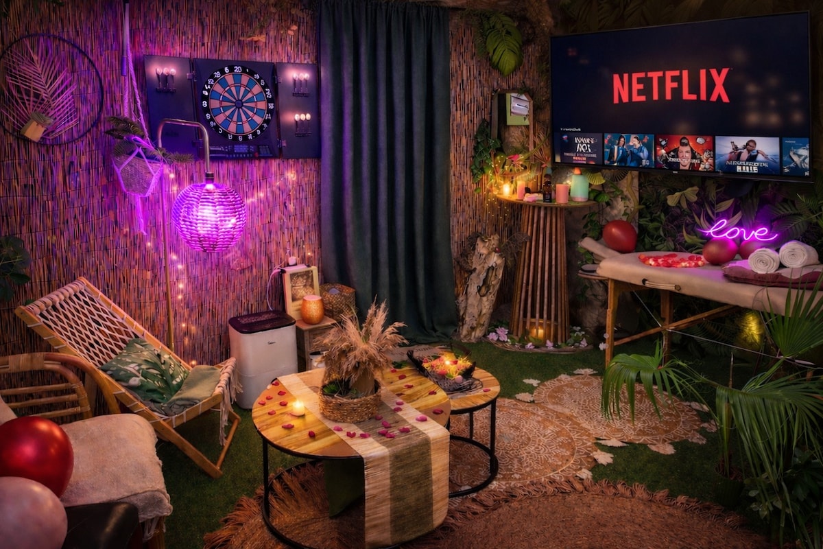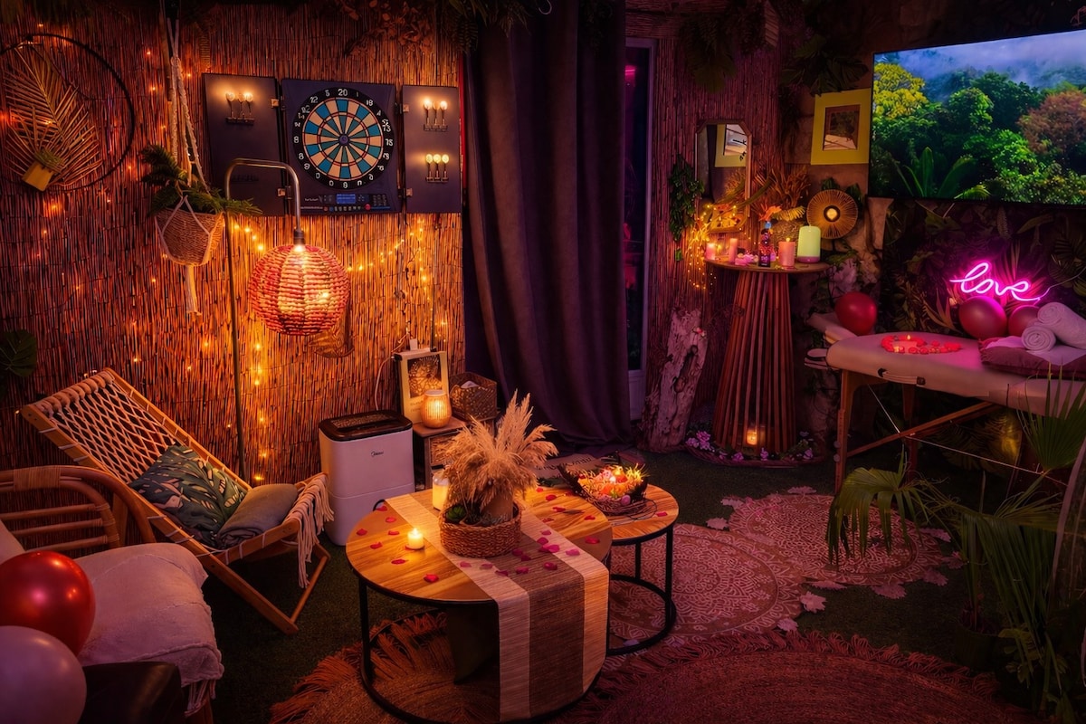 ✨ Découvrez le Mirage Tropical , une parenthèse raffinée au bord de la Loire 🌴. Profitez d’un Spa , Table de Massage d’une terrasse élégante et d’un espace jungle dépaysant pour vous évader. Amusez-vous autour du jeu de fléchettes, partagez un apéro exotique ou détendez-vous dans une atmosphère unique. Le soir venu, la chambre s’illumine de couleurs envoûtantes pour un moment chic et romantique 💖. Ici, chaque détail sublime votre séjour pour créer des souvenirs mémorables.🌴❤️❤️💕💕💕👄🫂❤️