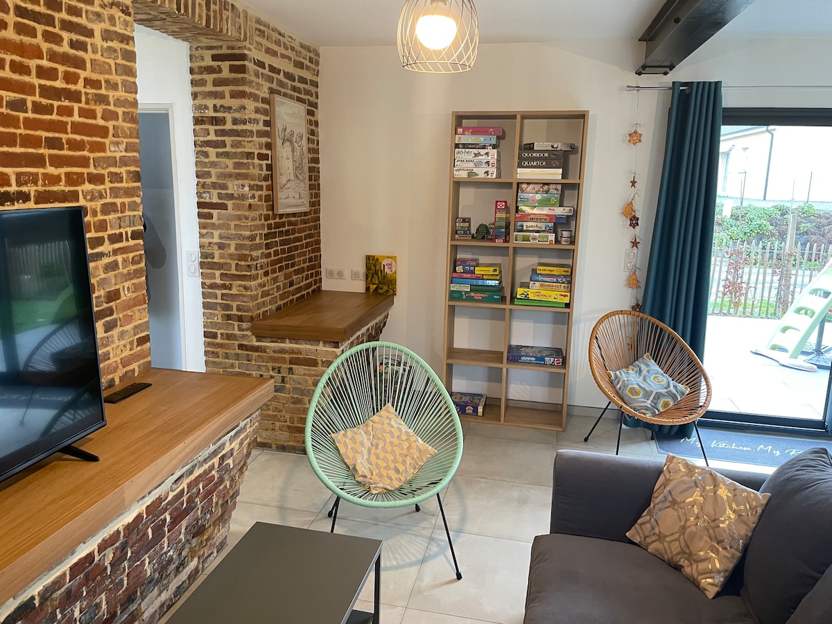 Le logement L'appartement est sur 2 étages avec 2 chambres en enfilade. Idéal pour un couple avec des enfants. L'accès se fait par un escalier extérieur menant à une terrasse surplombant le jardin privatif avec vue sur l'Église St Denis. L'appartement possède au 1er étage un séjour spacieux avec un coin repas attenant à la cuisine américaine, un salon équipé d'un poêle à bois, une salle de douche & des toilettes séparées. Un escalier intérieur dessert 2 chambres en enfilade à l'étage.