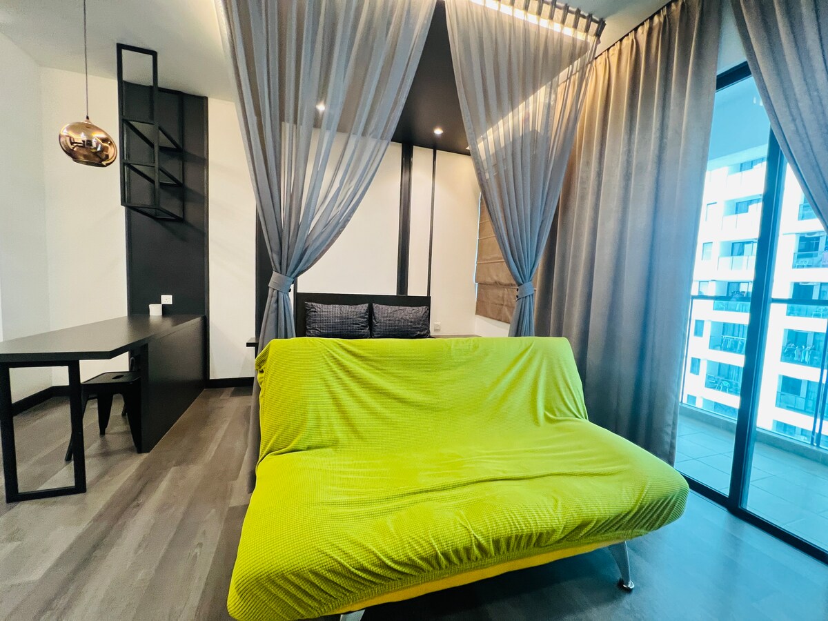 Istražite naš udobni studio apartman koji može da primi 2 do 3 osobe sa bračnim krevetom i sofom na razvlačenje. Samo 15 minuta vožnje od KLIA T1/T2, mjesto je okruženo mnogim restoranima, ograncima brze hrane, namirnicama i prodavnicama veša, a sve je u neposrednoj blizini. Uživajte u svim sadržajima, uključujući dječje igralište, prostor za roštilj, teretanu i bazen, uz non-stop bezbjednost. * Nije dostupno, ostavite prtljag prije vremena prijave. Zbog dizajnirane zgrade, morate da pređete 10 stepenica da biste došli do lifta.