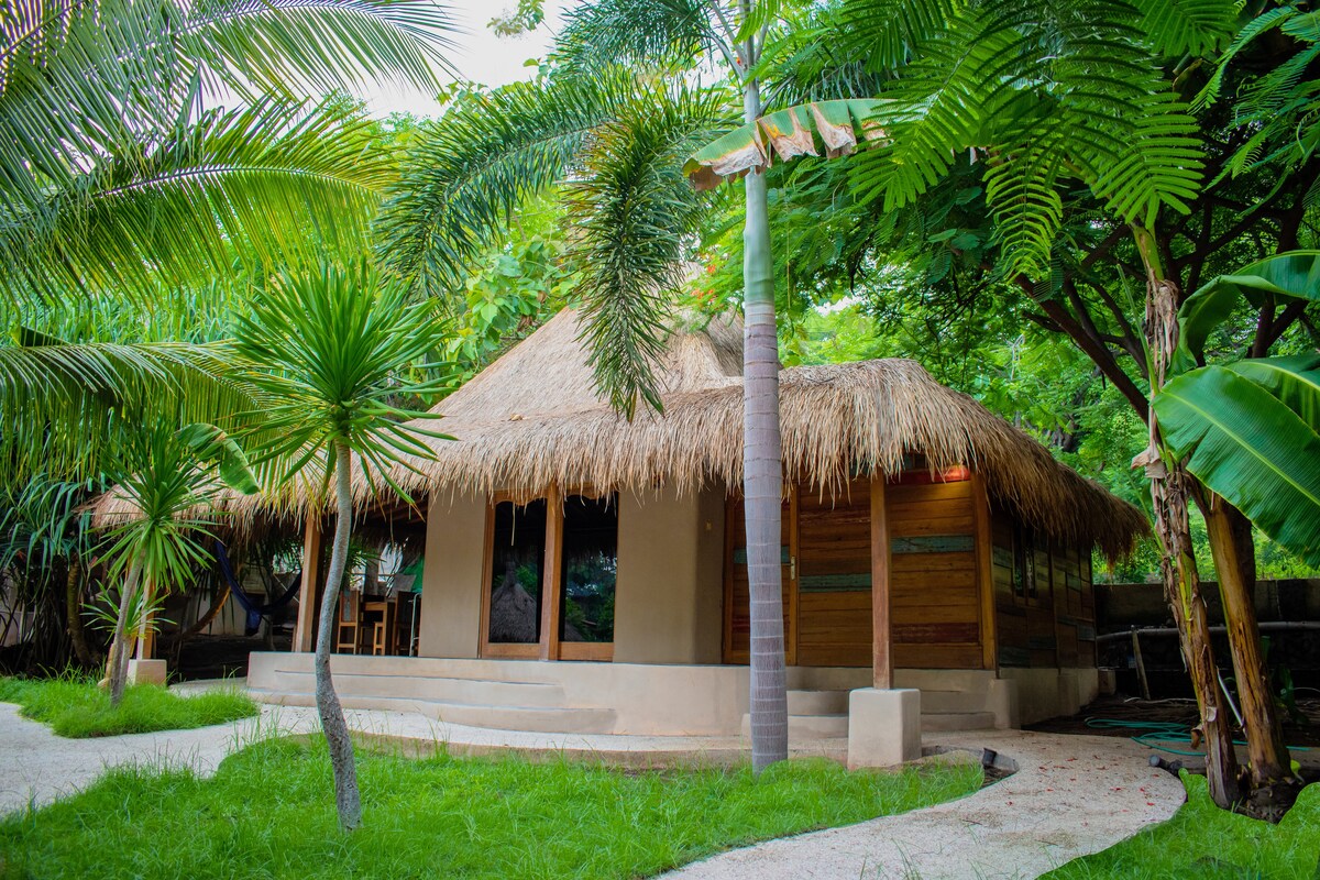 Tradicionalni bungalov s travnatim krovom (1 od samo 4) udaljen je samo nekoliko minuta hoda od prelijepih bijelih pješčanih plaža i tirkiznog okeana. Smješten u kokosovom šumarku na ivici sela. Bračni krevet (širine 180-220 cm), sa klima-uređajem i ventilatorom. Privatno kupatilo, terasa i bašta, besplatan WI-FI. Konkurentne cene nisu uz plažu, ali su veoma prijatne, udobne sobe sa ukusnim doručkom. Pogledajte našu priču na društvenim mrežama :). Čisto, higijensko, lako se udaljeno.