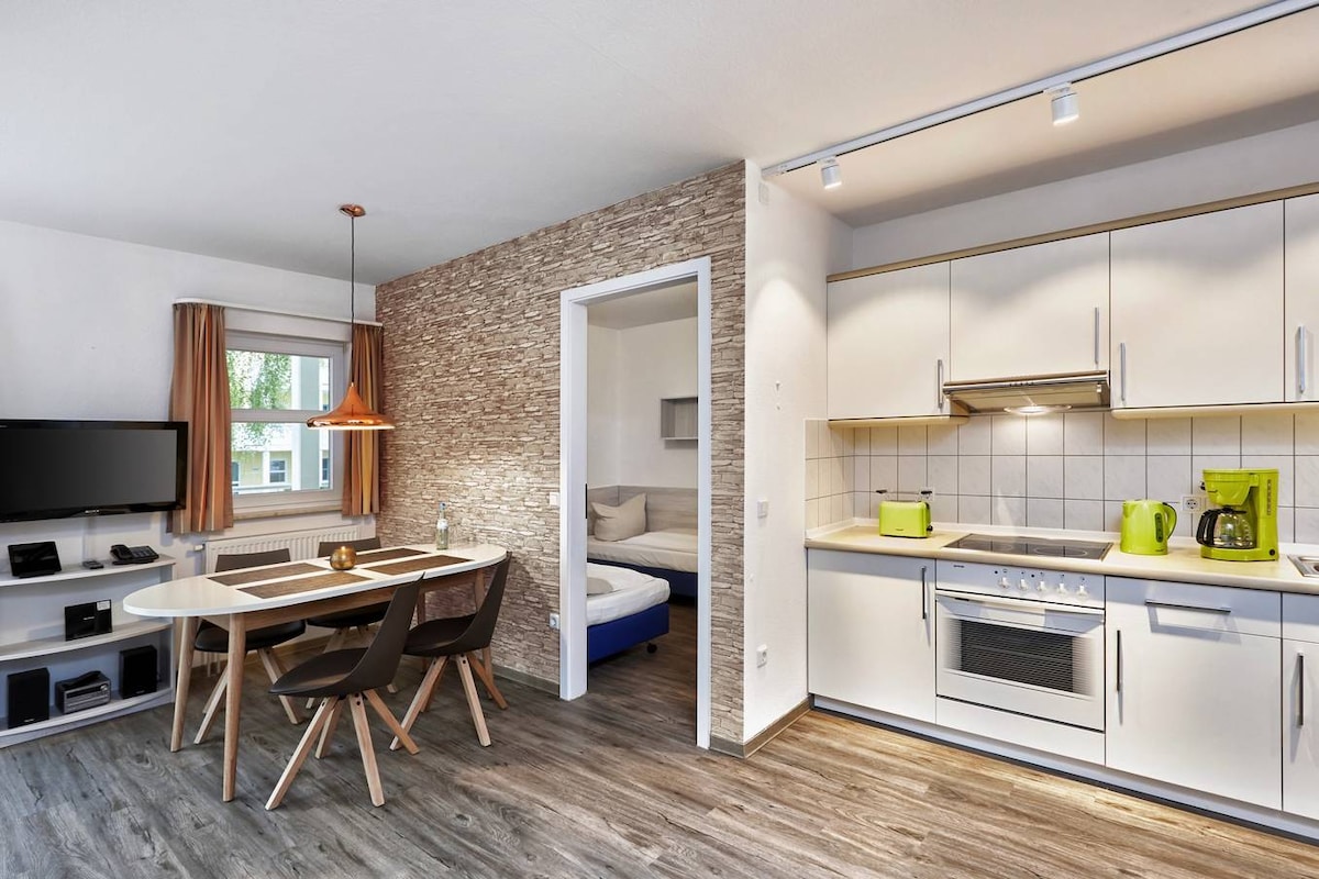 Savršeno za parove ili male porodice na odmoru na Baltičkom moru! Sa jednom spavaćom sobom i udobnim kaučem na razvlačenje, ovaj apartman može da ugosti do 3 osobe (uklj. Beba /dete). Veliki dnevni boravak i prostor za kuvanje ne ostavljaju ništa za poželjeti: potpuno opremljenu kuhinju sa rernom, keramičkom pločom za kuvanje, mašinom za pranje sudova i frižiderom sa zamrzivačem; veliki trpezarijski sto; moderan TV; kamin i velika terasa. U velikom kupatilu se možete razmaziti hidromasažnom kadom, tušem i saunom.
