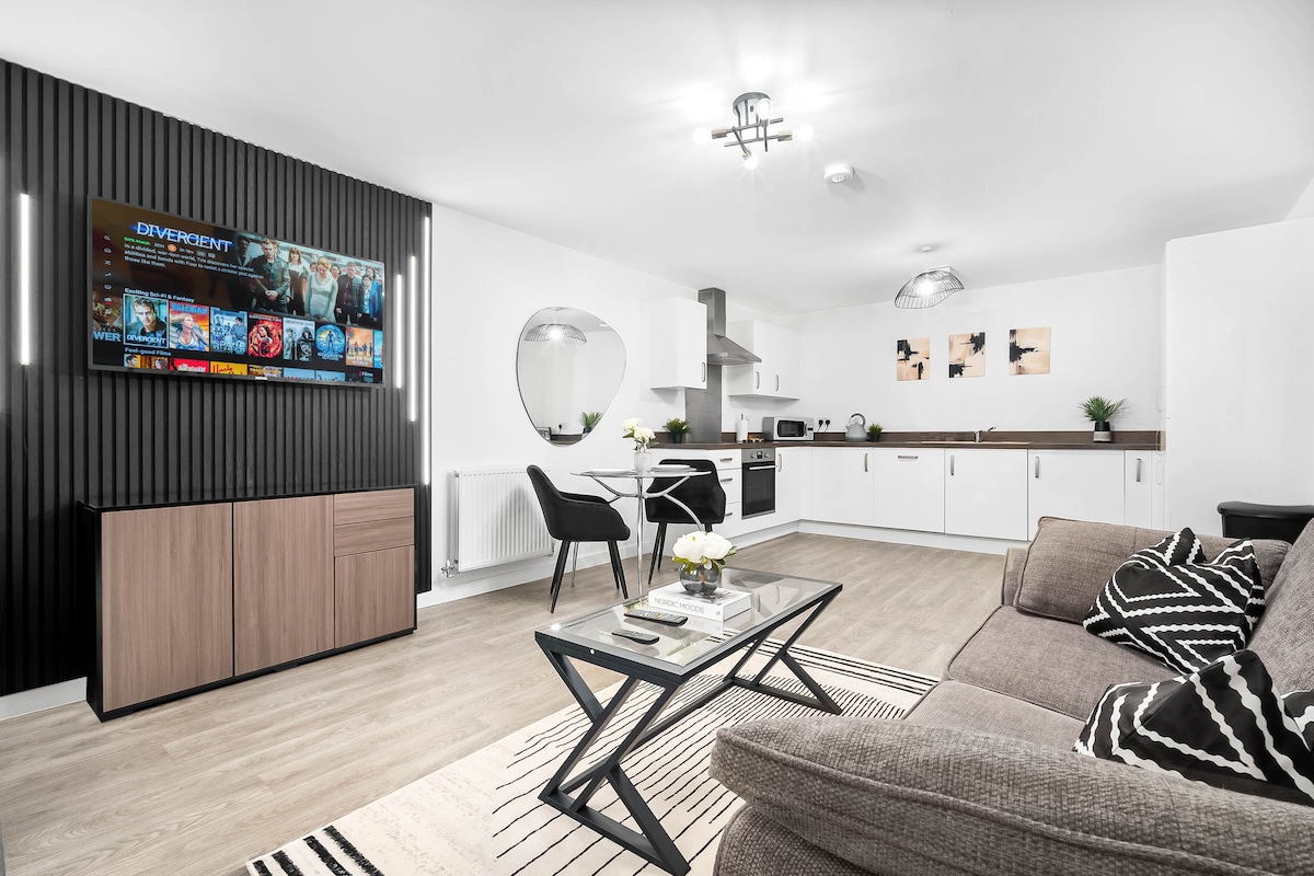 Predivan, čist i prostran, novogradnja, idealno smešten. Savršeno za parove koji posjećuju Cadbury World i druge lokalne lokacije, mlade profesionalce koji putuju u centar grada ili srodnike studenata koji studiraju na Univerzitetu u Birmingemu. Karakteristike: - Prostrana kuhinja/dnevni boravak - Elegantna estetika - Dvokrevetna soba - Namjenski prostor za parkiranje direktno ispod stana na privatnom i dobro osvetljenom parkingu - 10 minuta hoda do železničke stanice - 5 minuta vožnje od univerziteta u Bhamu - 4 min vožnje do Kadberi Vorlda