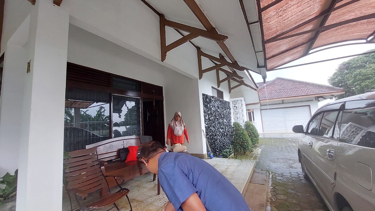 Nikmati ketenangan di rumah kami yang asri, dengan nuansa alam yang menenangkan. Tempat ini ideal untuk bersantai bersama keluarga atau sahabat. Rumah ini terasa sangat nyaman berkat sirkulasi udara dan cahaya alami yang baik. Lokasinya di samping kebun buah, dengan lahan parkir yang luas (muat 4 mobil). Dapur lengkap tersedia untuk Anda yang suka memasak. Dapatkan pengalaman unik dengan bermain bersama ayam dan kelinci peliharaan kami (mohon izin terlebih dahulu).