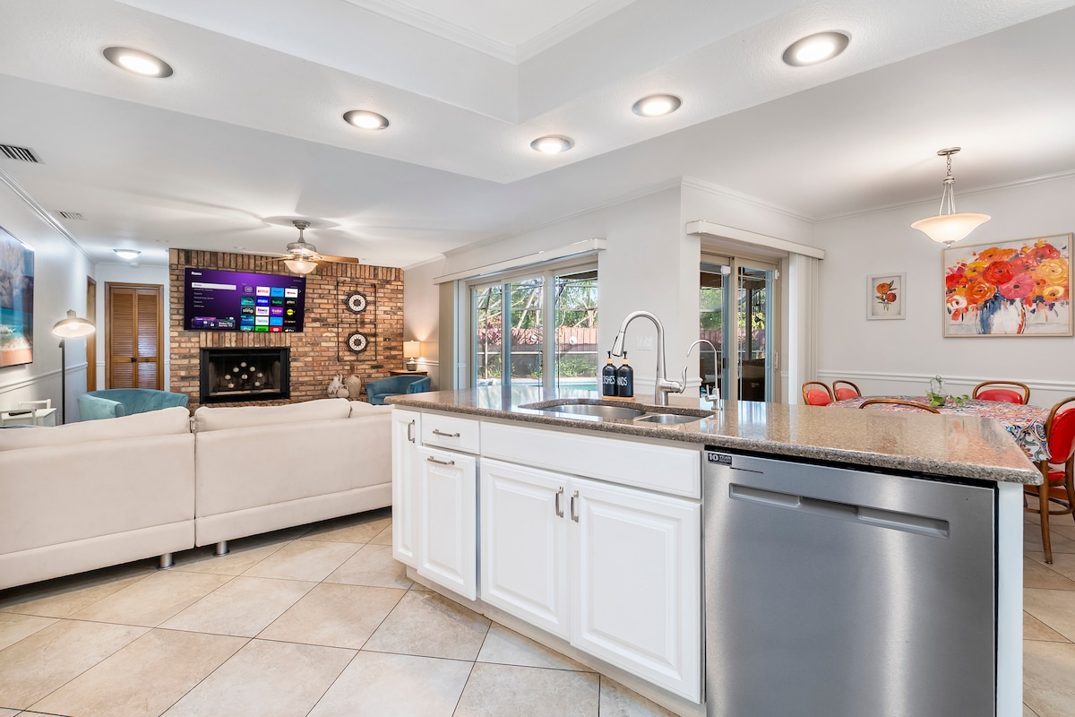 UTOPIJA najbolje opisuje ovu savršenu KUĆU ZA ODMOR NA jednom spratu! 5 MINUTA VOŽNJE DO PLAŽA!! OGROMAN NEVJEROVATAN GRIJANI BAZEN S BESPLATNIM GRIJANJEM U ODMARALIŠTU, LUKSUZNOM PERGOLOM, HIDROMASAŽNOM KADOM , TIKI BAROM i mnoštvom terasa savršenih za uživanje u suncu na Floridi! Velika kuća s bazenom s 3 spavaće sobe i 3 kupatila. Grijanje bazena počinje 15. oktobra i traje do 15. aprila sezonski BESPLATNO( zagrijava 80-85 stepeni), velika hidromasažna kada za četiri osobe je vruća i spremna na 101° po vašem dolasku. Nema čekanja da se hidromasažna kada zagrije!