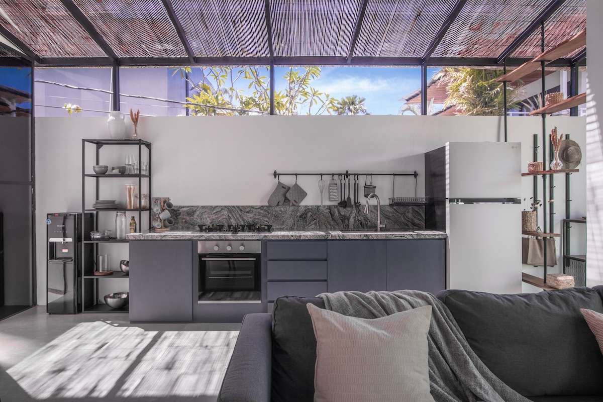 Vila za medeni mesec sa ogromnim bazenom i kokosovom baštom. Odlična lokacija na pešačkoj udaljenosti od svih restorana i kafića u Canggu. Ogroman privatni bazen i sunce ceo dan, savršeno za sunčanje na terasi. Dve spavaće sobe imaju bračne krevete, klima-uređaj i 55-inčne televizore + kupatila. Dnevni prostor sa klima-uređajem, kompletnom kuhinjom, trpezarijom i Bluetooth zvučnikom. Osoblje svakodnevno dolazi radi čišćenja i masažnog stola u kući – savršen način da se opustite. Okruženi smo najboljim kafićima i restoranima na Baliju, na odličnoj lokaciji na plaži Eho i Batu Bolongu.