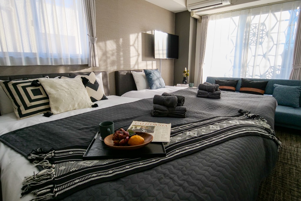 位於東京最具代表性的淺草寺商圈核心地段. 全新打造的工業風高性價比自助入住 HOTEL. 低樓層,沒有設立電梯,房費更便宜. 步行約 6 分鐘即可抵達淺草寺及周邊主要觀光景點. 周邊生活機能完善,鄰近多家特色餐廳、24 小時便利商店、藥妝店與大型超市,短期旅遊與長期入住皆非常適合. ◆ 26㎡ 公寓式雙人房|3楼| •雙人大床 1 張(150cm × 200cm) •桌椅組 1 組 •專屬獨立陽台 房内提供完善的生活家電與設備,讓您在旅途中也能享有如同在家的便利與安心: •免費 Wi-Fi •大冰箱・洗衣機・烘乾機 •微波爐・電磁爐・電熱水壺 •吹風機 •智能免治馬桶 •冷暖氣空調 •全身鏡等一應俱全 為減輕旅途行李負擔,房內已備妥多項生活備品,讓您輕鬆入住: •洗髮精・潤髮乳・沐浴乳・洗手乳 •洗碗精・洗衣精 •浴巾・毛巾・室內拖鞋 •牙刷與牙膏 •衛生紙・面紙 •礦泉水・杯子 •雨傘・香氛擴香機等 專業清潔・安心入住:由日本專業清潔團隊進行全面清掃,床單與寢具皆依照星級飯店標準鋪設並更換,確保每位旅客都能享有乾淨、舒適、安心的住宿.