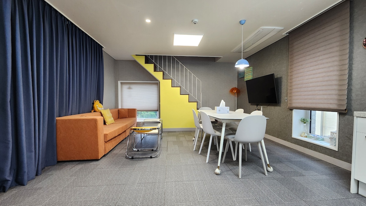 📍 “아이도 웃고, 어른도 쉬는 집” ⭕ 유아포함 최대 7인 까지 가능 ( * 예약된 인원과 다를경우 입실 불가) 조용한 단독주택 단지에 위치하며, 플레이룸 에서의 즐거운시간 ~ 아이는 마음껏 뛰놀고, 어른들은 여유롭게 쉴 수 있는 공간. (음주시 조용하게 즐기기-외부 소음은 민원) 🎮 플레이존 하이라이트: 7가지 레트로 게임기, 키즈 인기 게임기, 소형 당구대, 다트, 여러가지 다양한 게임기 보유 ! 3룸+2욕실 구성으로 가족 여행에 완벽하게 최적화된 감성 숙소예요. 1. 객실3개 (7인 가능 침대구성) 객실1 - 최대 3인 객실2 - 최대 2인 각실3 - 최대 2인 2. 욕실2개 (3층, 2층) 3. 1층 주방 별도 보유 4. 1.5층거실 과 힐링공간 테라스 보유 5. 지하- 작은 플레이존 6. 마당 식사공간 (바베큐시설은 없음) *** 필독 마당에는 힐링되는 흡연 공간 보유.