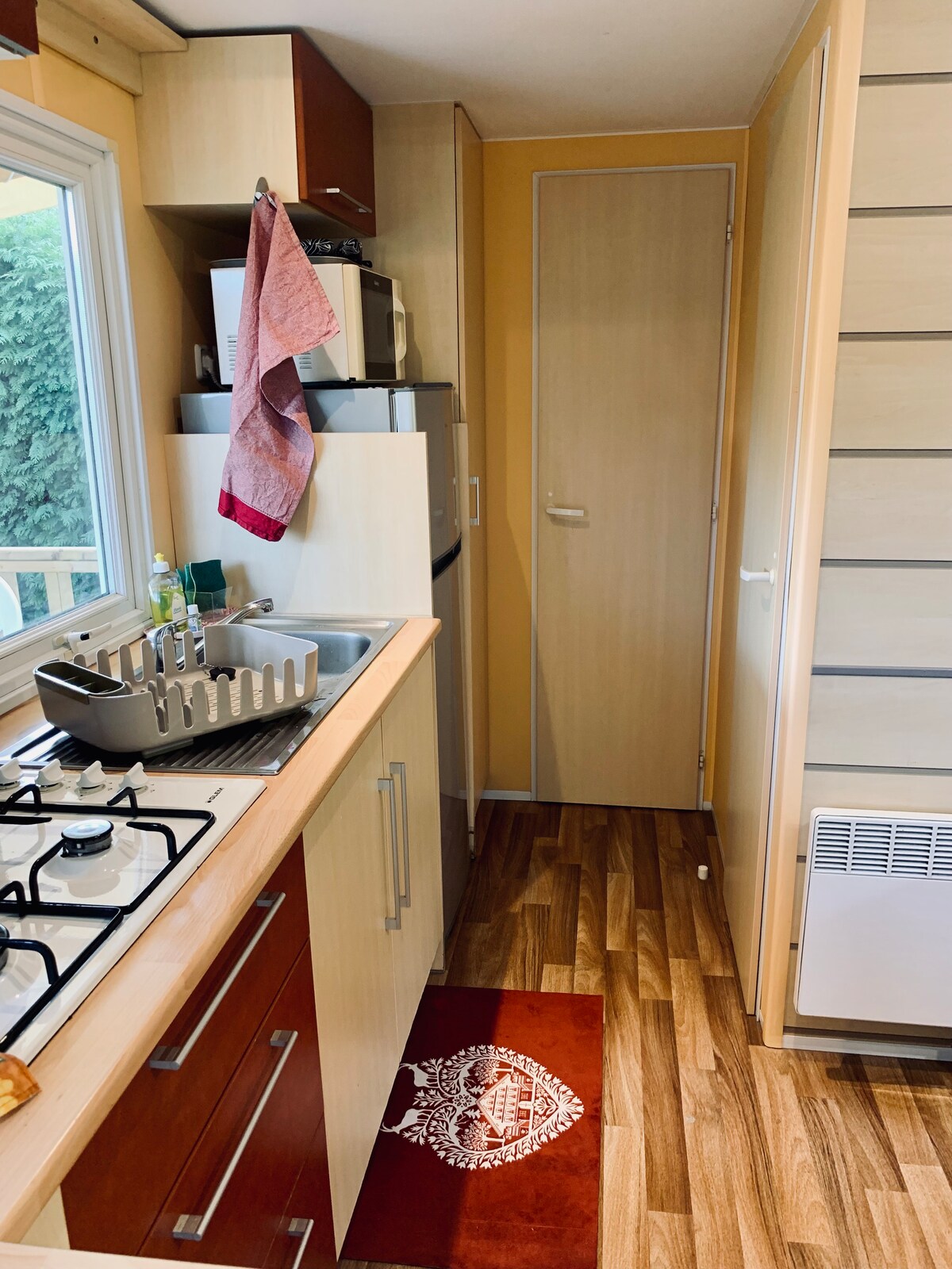 Mobilna kuća na zatvorenom zemljištu, između mora i jezerca, u bezbednom, mirnom i porodičnom kampu. Kapacitet: 5: - 1 spavaća soba sa krevetom 140 - 1 spavaća soba sa krevetom 140 + 1 krevetom na sprat za decu. Svaki krevet je opremljen zaštitnicima za dušeke, jorganima, jastucima i jastucima sa zaštitnim navlakama. Posteljina (posteljina, peškiri...) može da se obezbedi uz dodatnu cenu od 20 EUR i 10 EUR/dodatni krevet. Čišćenje koje obavljaju gosti ili uz plaćanje u iznosu od 50 EUR