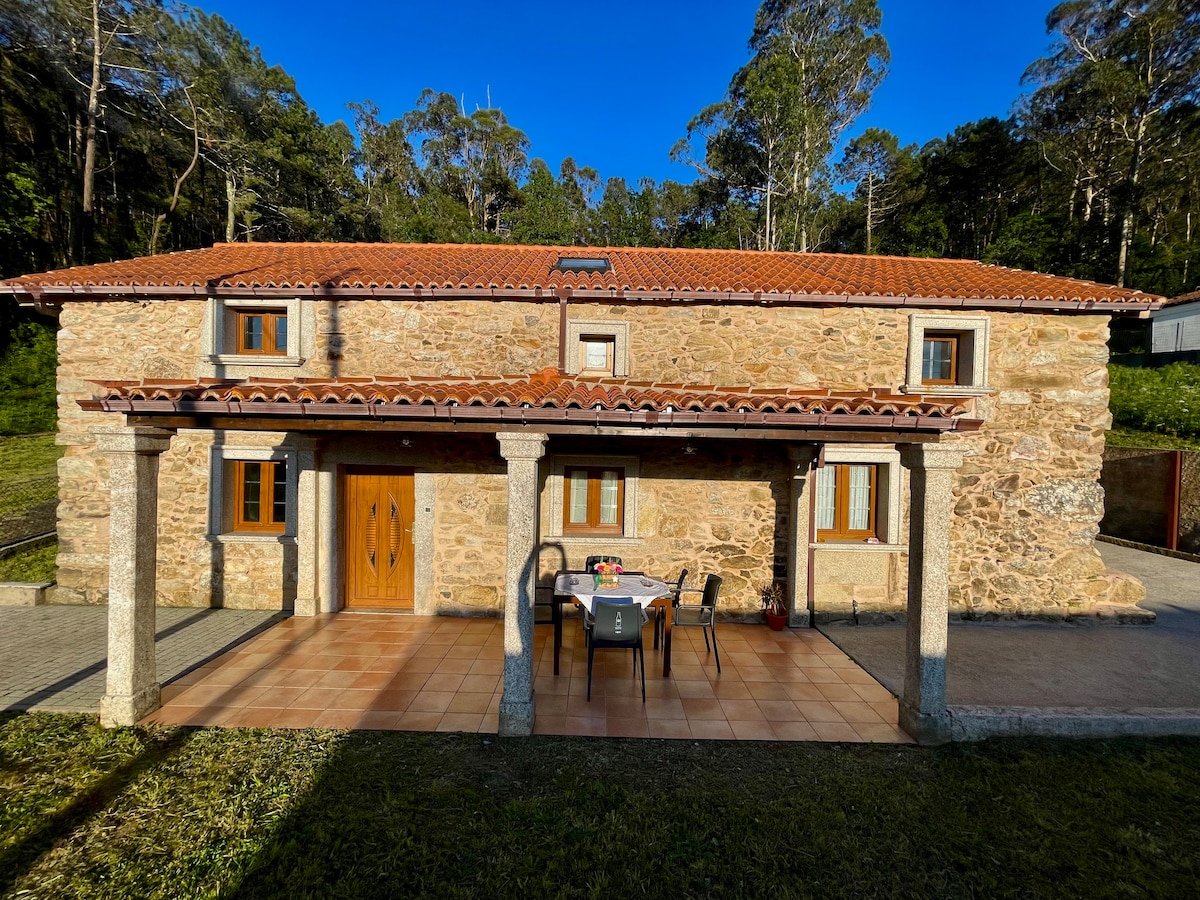 Charming stone cottage nestled in the serene countryside of Rías Baixas. Ideal for families or small groups, it features a wood-burning fireplace, high-speed Wi‑Fi, and sweeping sea views. Crane your gaze over lush trails, hidden beaches, Galician culture, and gourmet delights, all just 30 minutes from Santiago de Compostela.