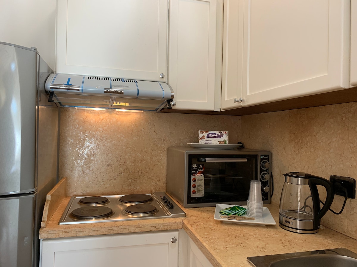 Boravite u elegantnom studiju u mirnoj vili sa bazenom, baštom i toplom arapsko-modernom atmosferom. Sve što vam treba je samo nekoliko trenutaka dalje: • 800 m od bolnice Haram • 700 m od autobuske stanice Go • 400 m do najbliže apoteke • 350 m do supermarketa • 700 m do džamije • 900 m do crkve • 1 km do plaže. Uživajte u buđenju u mirnom, udobnom prostoru sa nenadmašnom pogodnošću – centralna lokacija osmišljena da vaš boravak učini lakim i opuštajućim.