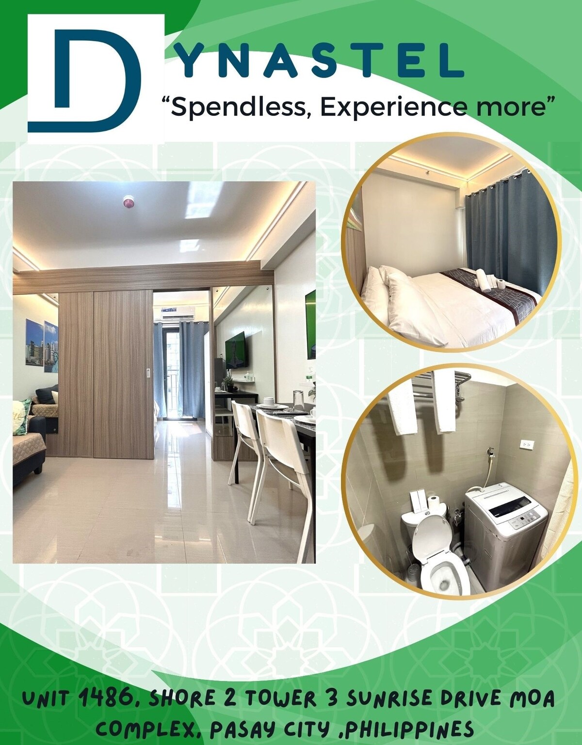 Boravite u udobnom stanu sa bračnim krevetom i opuštajućim balkonom koji je pogodan za porodični i grupni boravak. Dobro opremljen stan sa neverovatnim i opuštajućim bazenima, ukusnim restoranom i lakim pristupom rekreacionim aktivnostima, maloprodajnim objektima i važnim poslovnim centrima. Jedan od najvećih tržnih centara, SM Moa, zajedno sa SMX-om i Ikea, udaljen je samo peške. Aerodrom NAIA, Okada, Solaire, COD, PICC, WTC i Manila Bay su dostupni u blizini.