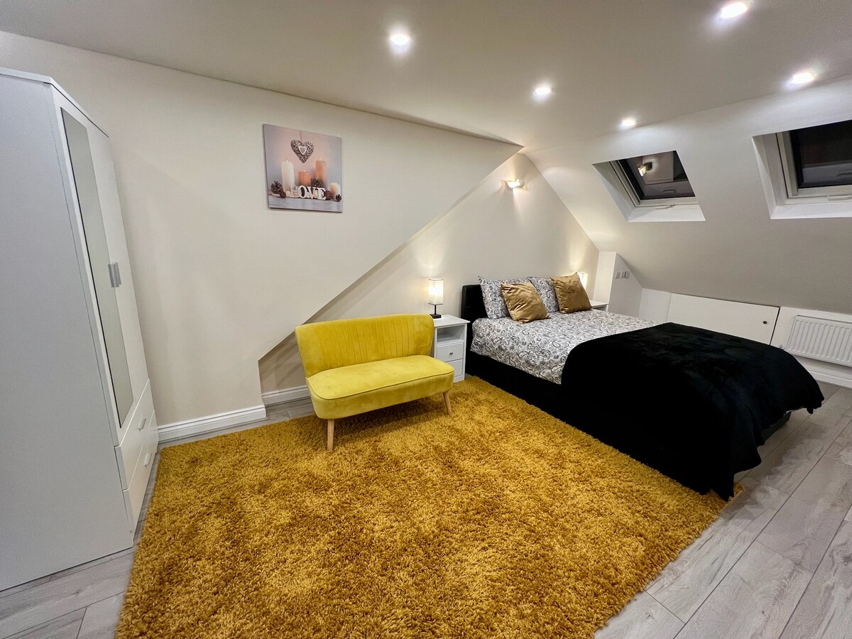 Samostalni apartman za goste u prizemlju s 1 spavaćom sobom. Sa bračnim krevetom, pametnim televizorom od 43inča i besplatnim bežičnim internetom. Vrhunska egipatska posteljina, mekani peškiri i ogrtači za kupanje osiguravaju da se opustite i opustite. Luksuzna spavaća soba sa samostojećim kupatilom, mokra soba sa električnim tušem i grijanom prečkom za peškire. Odvojite trpezariju za doručak sa pripremom čaja / kafe od 24 sata i mini frižiderom.