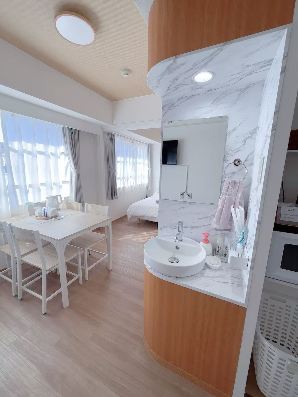 To je elegantan i moderan stan. Udaljen je 2 minuta hoda od istočnog izlaza stanice Shin-Osaka. Do Kjota možete stići za 30 minuta. Možete da ostavite prtljag od 10:30. Maksimalno 4 osobe sa 2 poludvostruka kreveta (širine 120 cm).Soba ima sobu sa kupatilom i WC-om. Deca mlađa od 5 godina su besplatna. (Soba se nalazi na prvom spratu, tako da ne morate da se penjete stepenicama.) Uživajte u elegantnom boravku u ovom smeštaju koji se nalazi u centru grada.