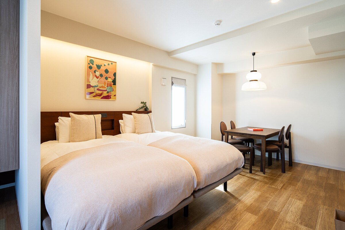 Novoizgrađena imajući u vidu putnike. Sobe su prostrane sa bračnim krevetima (praktično neviđeno u Japanu). Smart TV, Wi-Fi, čaj i kafa. Kupatila su moderna, sa velikim tuševima sa kišnim tuševima. LED ogledala koja će vas pripremiti za osvetljenje na koje naiđete. Sobe imaju barski frižider, mikrotalasnu rernu i kuvalo za vodu koje možete da čuvate i pripremite spremljene obroke i pića. Sve sobe su opremljene klima-uređajem, plafonskim ventilatorima i zavesama za zamračivanje. Dovoljno prostora i za odlaganje!