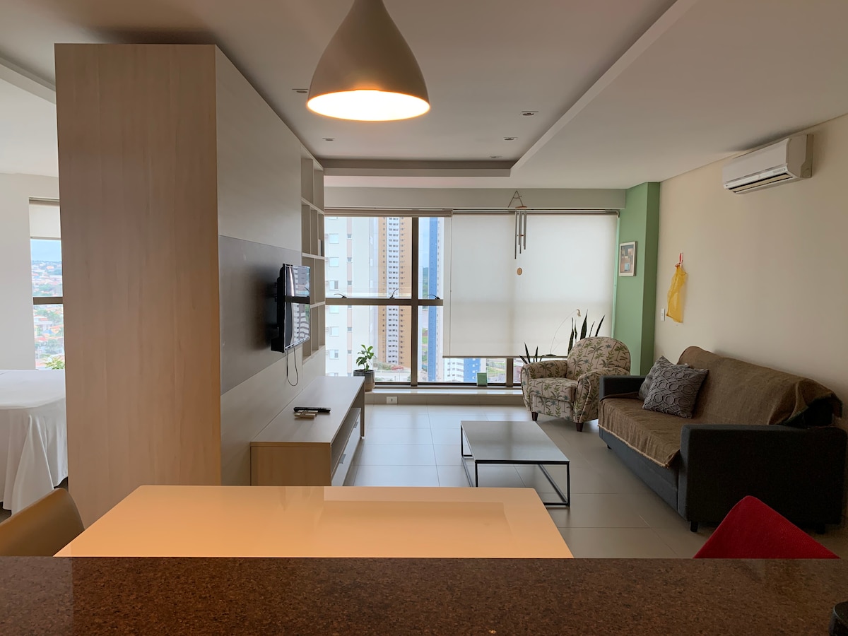 Moderan studio u Jardim dos Estados, sa panoramskim pogledom i kompletnom strukturom. Može da primi do 4 osobe (bračni krevet + kauč na razvlačenje), ima klima-uređaj, Wi-Fi od 300 mbps, opremljenu kuhinju, dva pametna televizora i privatnu natkrivenu garažu. U zgradi: grijani bazen, preljevni bazen, suva sauna, fitnes centar, zajednički rad, igraonica i vešeraj (plaćena upotreba). 24-satni konsijerž, panoramski lift i mnogo udobnosti na jednoj od najboljih lokacija u gradu.