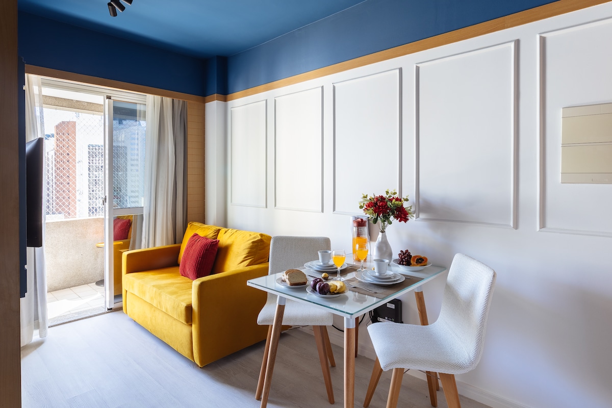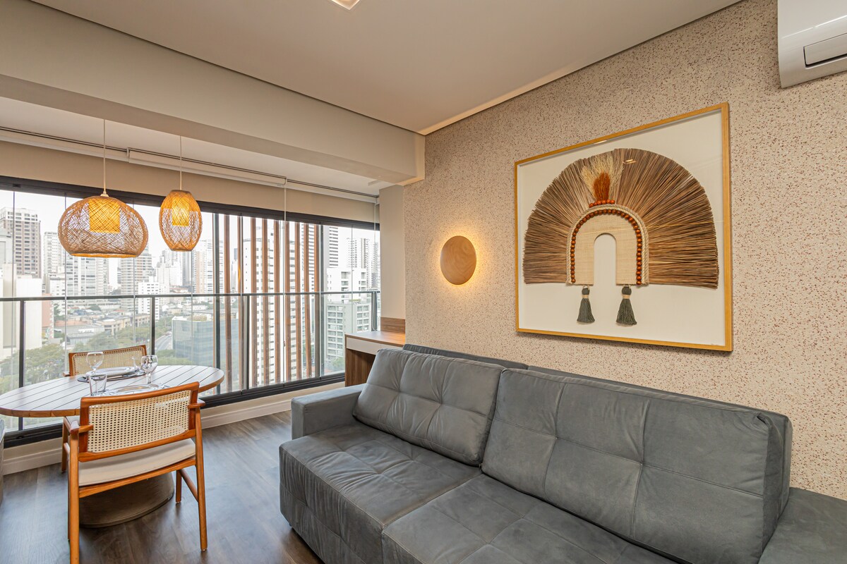 Bračni krevet (širok 150-179 cm), klima-uređaj, TV Smart 43”, svjetlovodni internet, 1 parking garaža, teretana i bazen. Pertinho da Avenida Paulista i sa jednostavnim pristupom podzemnoj željeznici. Fleksibilno vrijeme prijave i odjave! Provjerite dostupnost. :) Odlično za kućnu kancelariju: dvije nezavisne internet mreže - Vivo i Claro, obje sa 300 Mb. Svakodnevno čišćenje i pospremanje stana. Duži boravci (10ili više dana) uključuju promjenu kreveta i posteljine za kupanje.